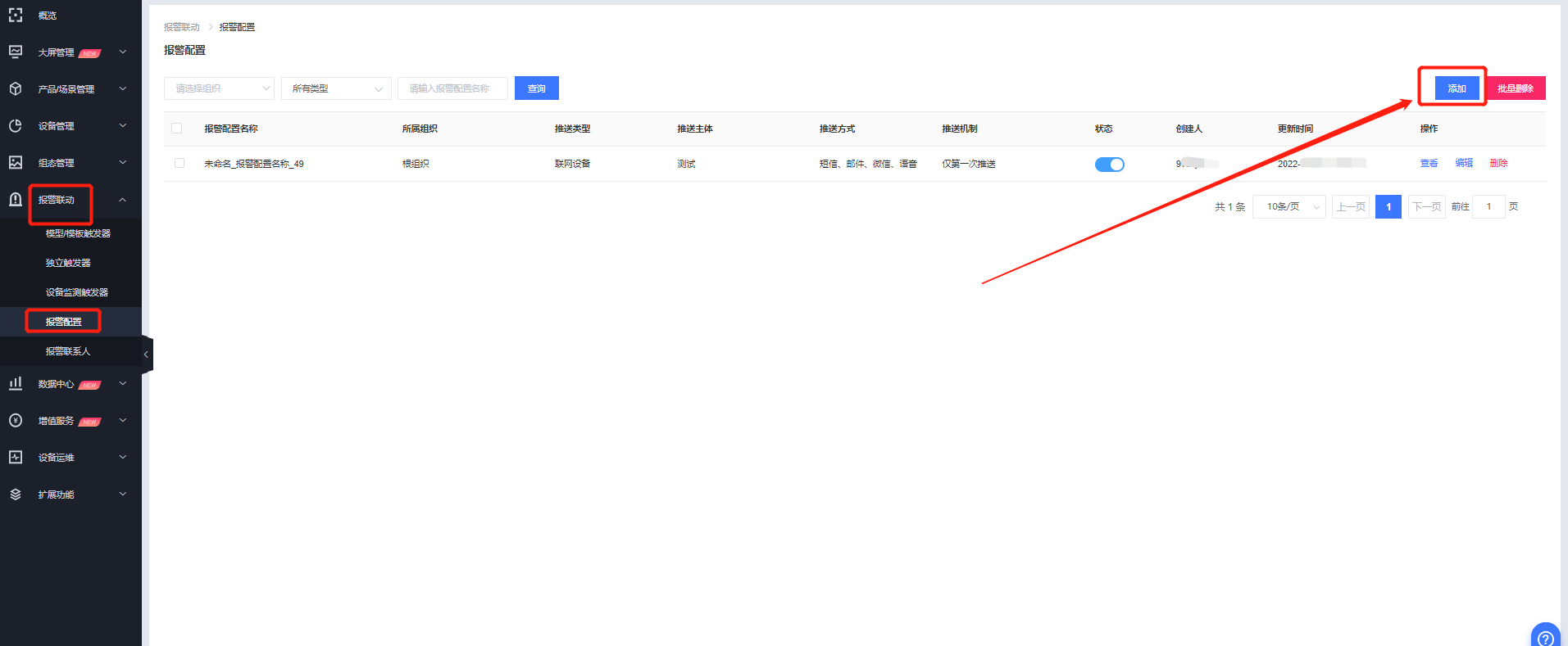 1、在平台“报警联动”--“报警配置”功能中点击添加,添加一个报警通知