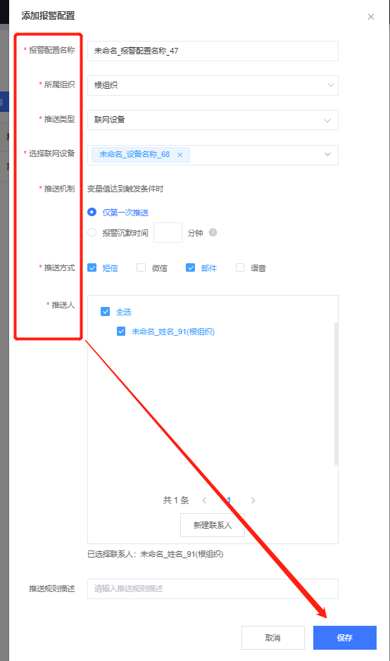 2、在弹出的对话框中,下拉框选择需要报警通知的设备,选择您需要的报警信息推送机制,报警方式及该报警的报警联系人,填好对应的信息后保存。