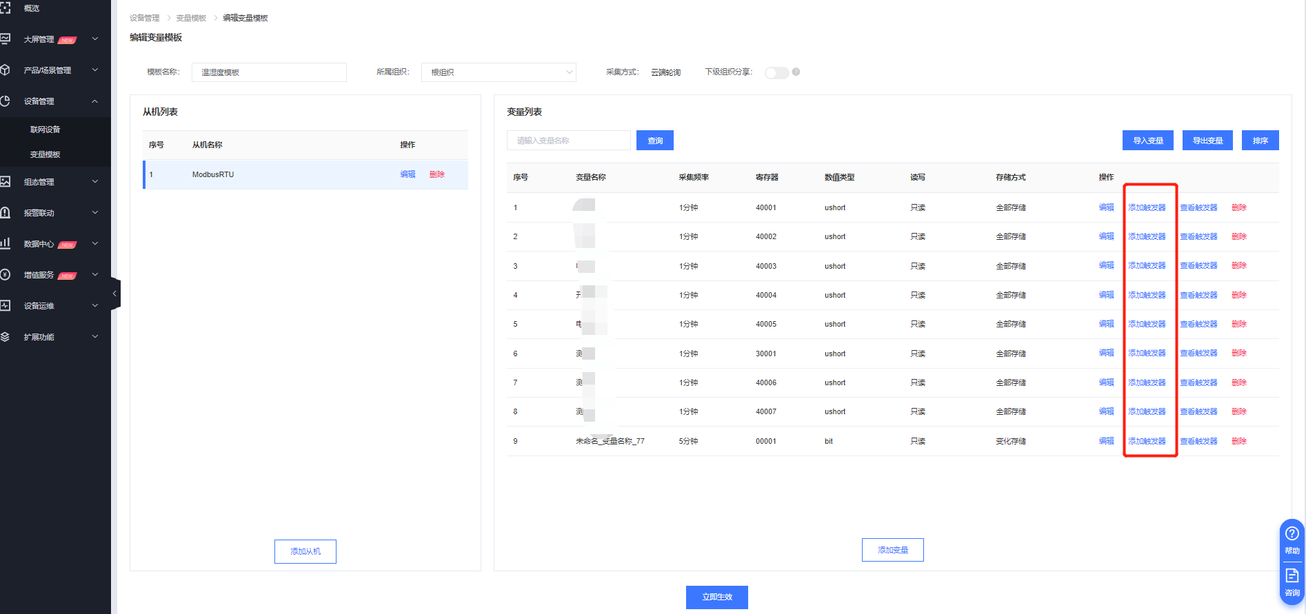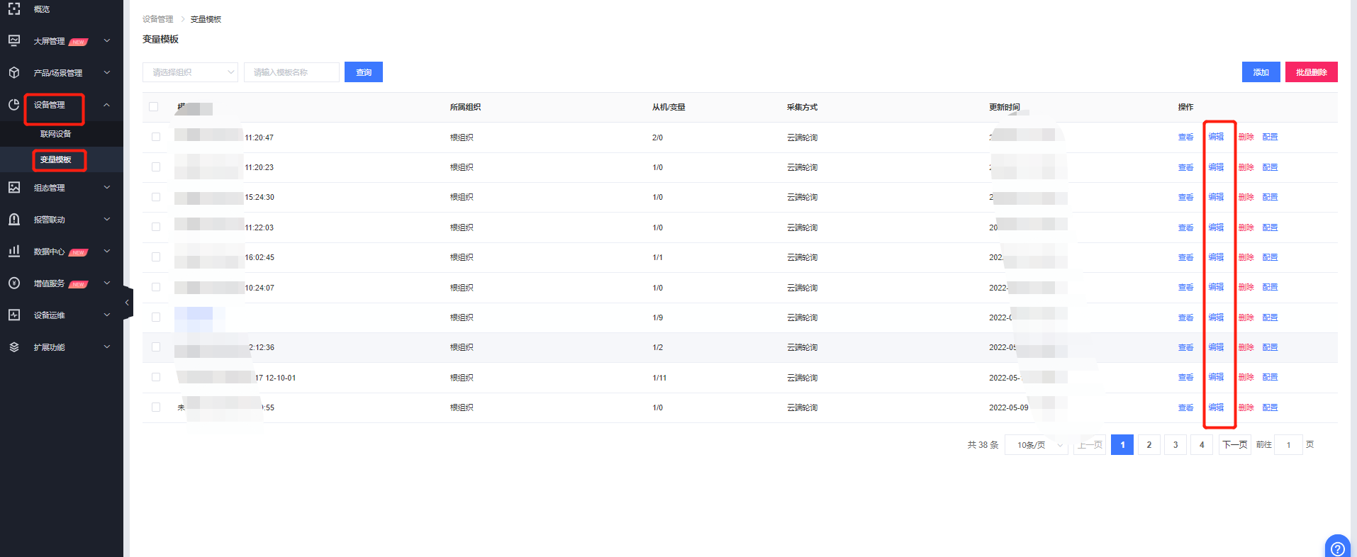 1、在“设备管理”--“变量模板”中,选择报警设备所使用的变量模板,进行编辑