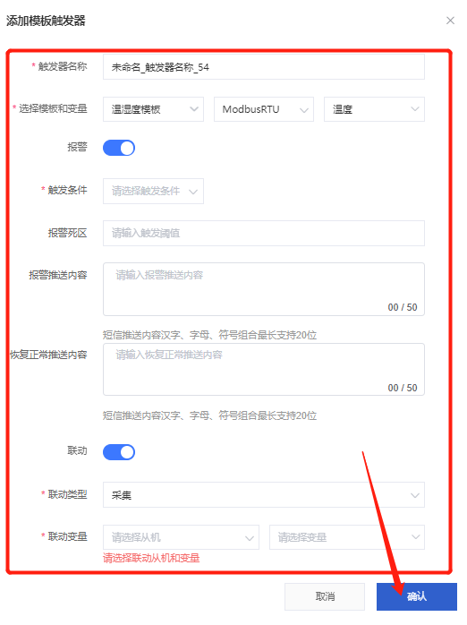 2、在数据点编辑页面选择添加触发器(注:在此处设置的报警规则,适用于所有应用该模板的设备,如果只想针对某个设备,可根据步骤二设置)
