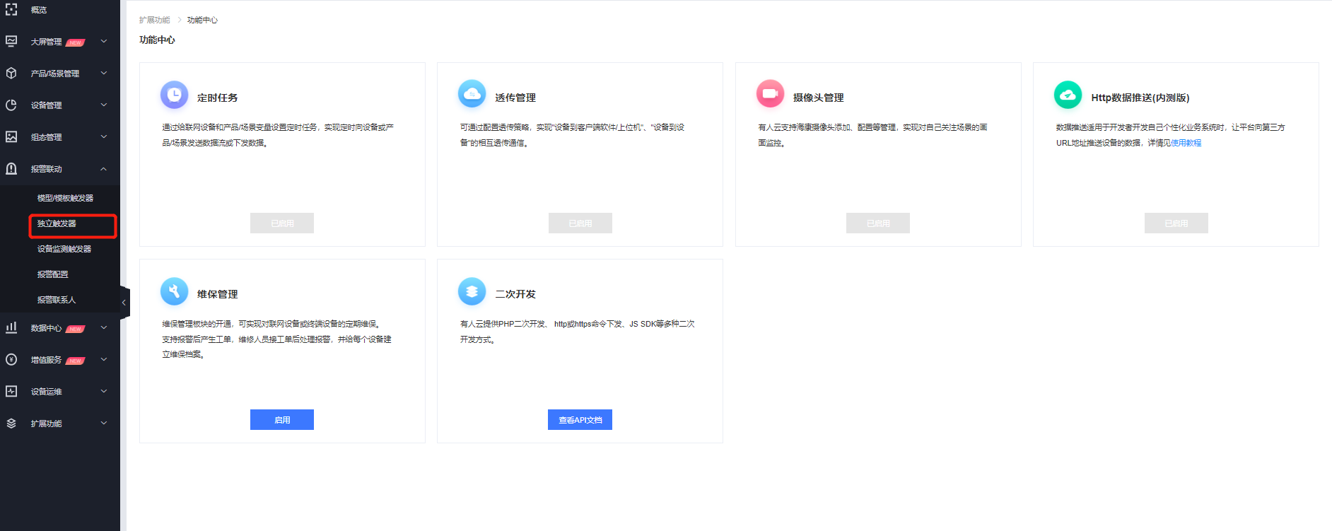 1、首先在“扩展功能”--“功能中心” 找到“独立触发器”功能并开通,开通后在左侧菜单栏就可以看到该功能选项