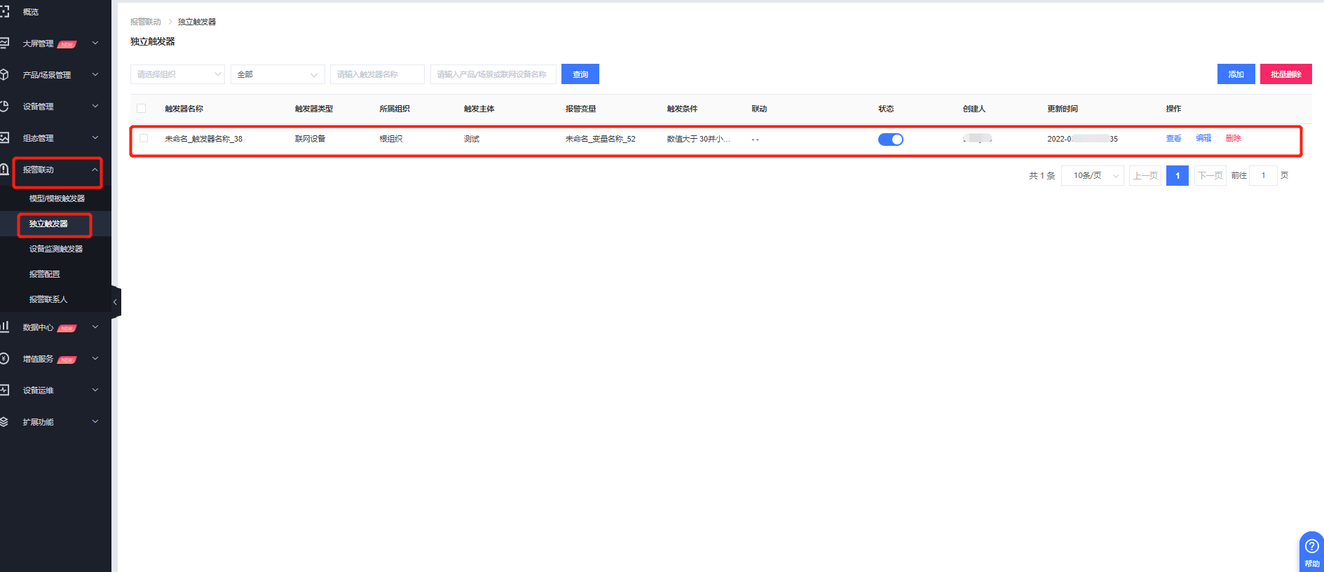 3、添加好后就可看见自己所添加的独立触发器及详细信息,报警状态为“启用”时,说明该独立触发器是启用状态,禁用则不会触发该规则的报警