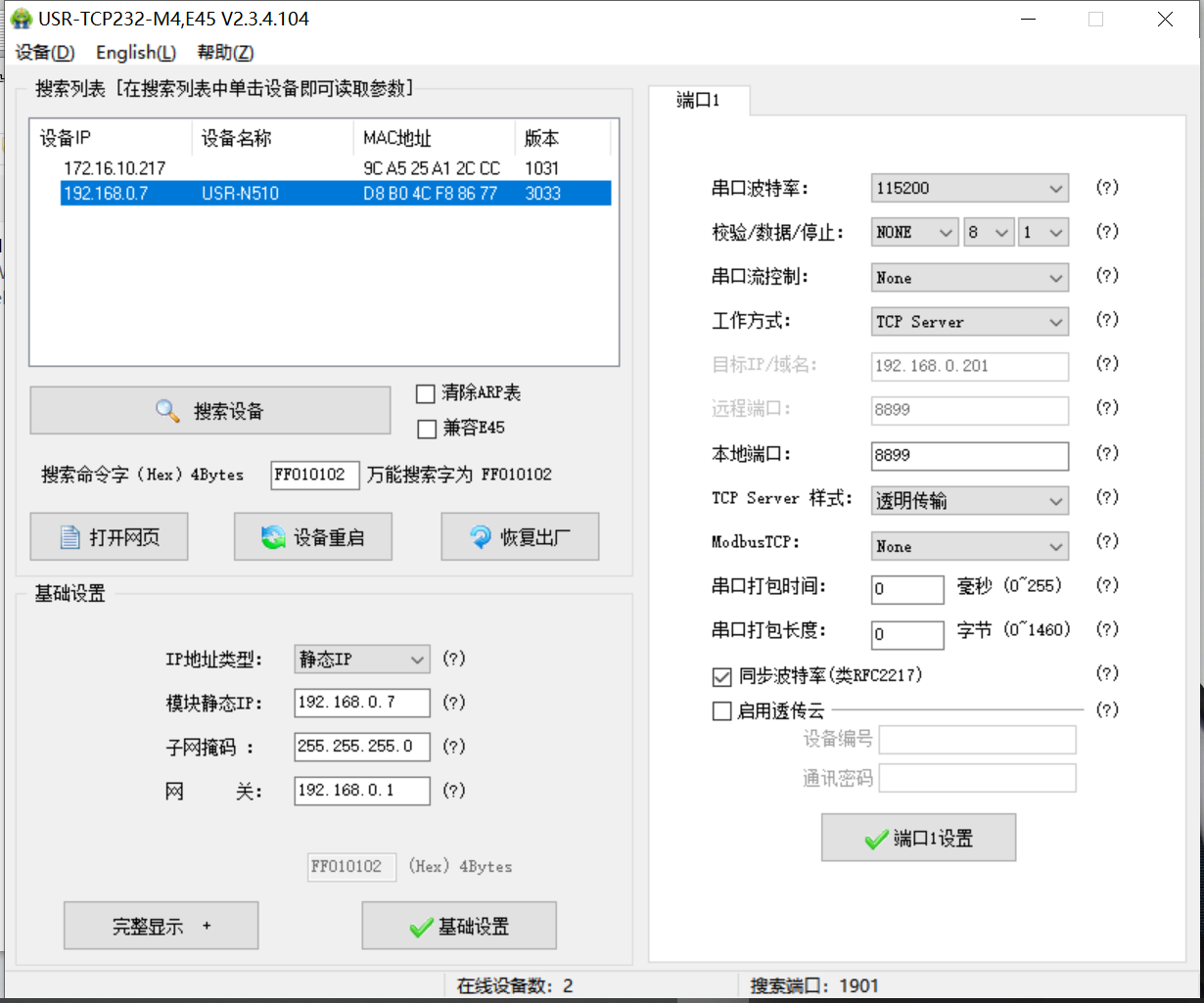 4. 打开设置软件,点击“搜索设备”当搜索列表中出现N510的设备后,单击搜索到的设备,查看其配置信息(上图为默认配置信息)。