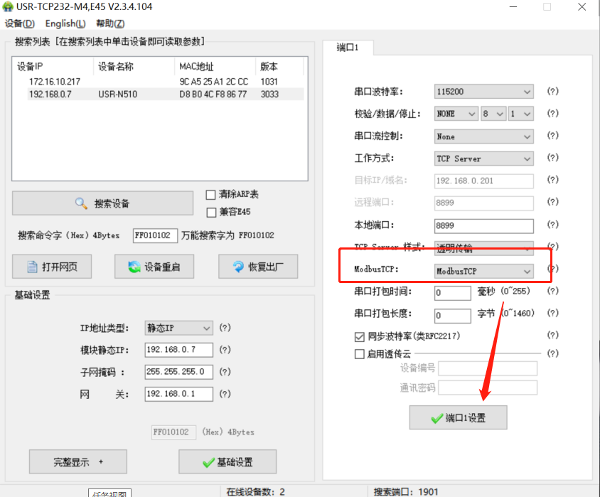 5. 下图中使能modbus TCP功能,设置完成后,重新搜索一次,确认参数是否修改成功