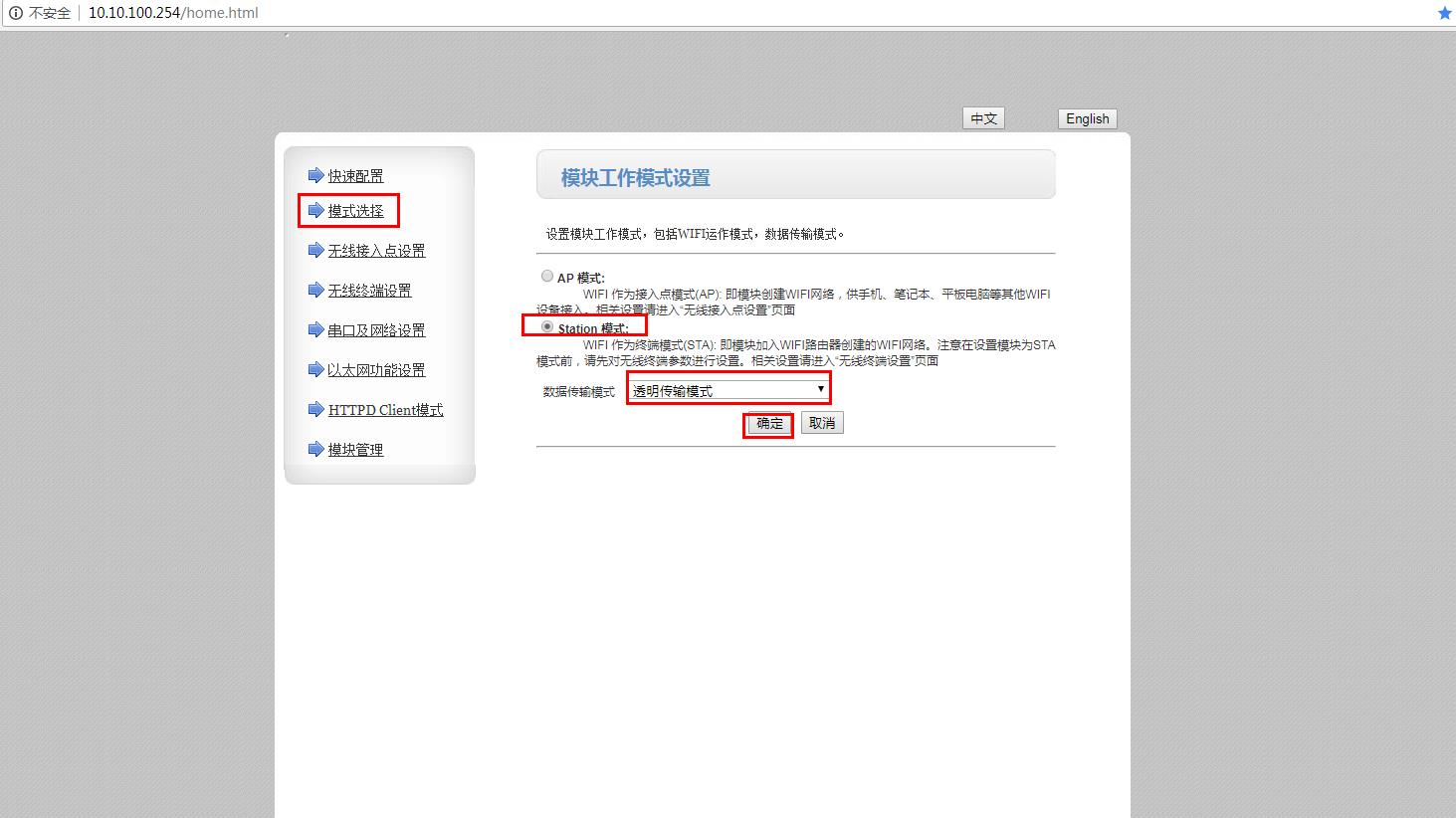 1、登录之后,在模式选择中,将USR-W610的工作模式从默认AP模式改为STA模式,点击确定,会跳出重启提示,建议不要立刻重启,需要所有网页参数设置完毕之后,最后再重启USR-W610。