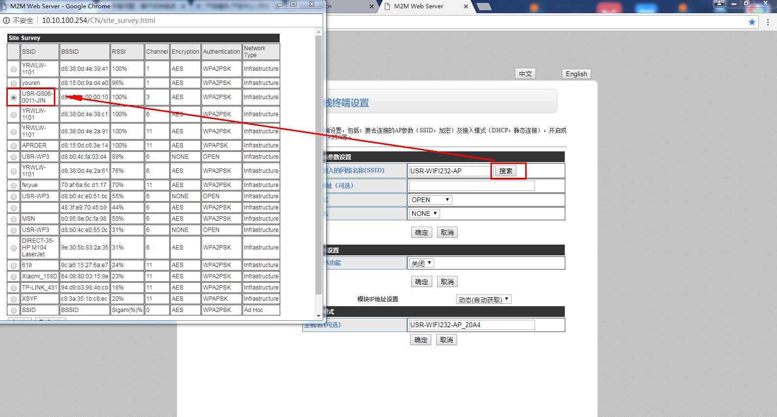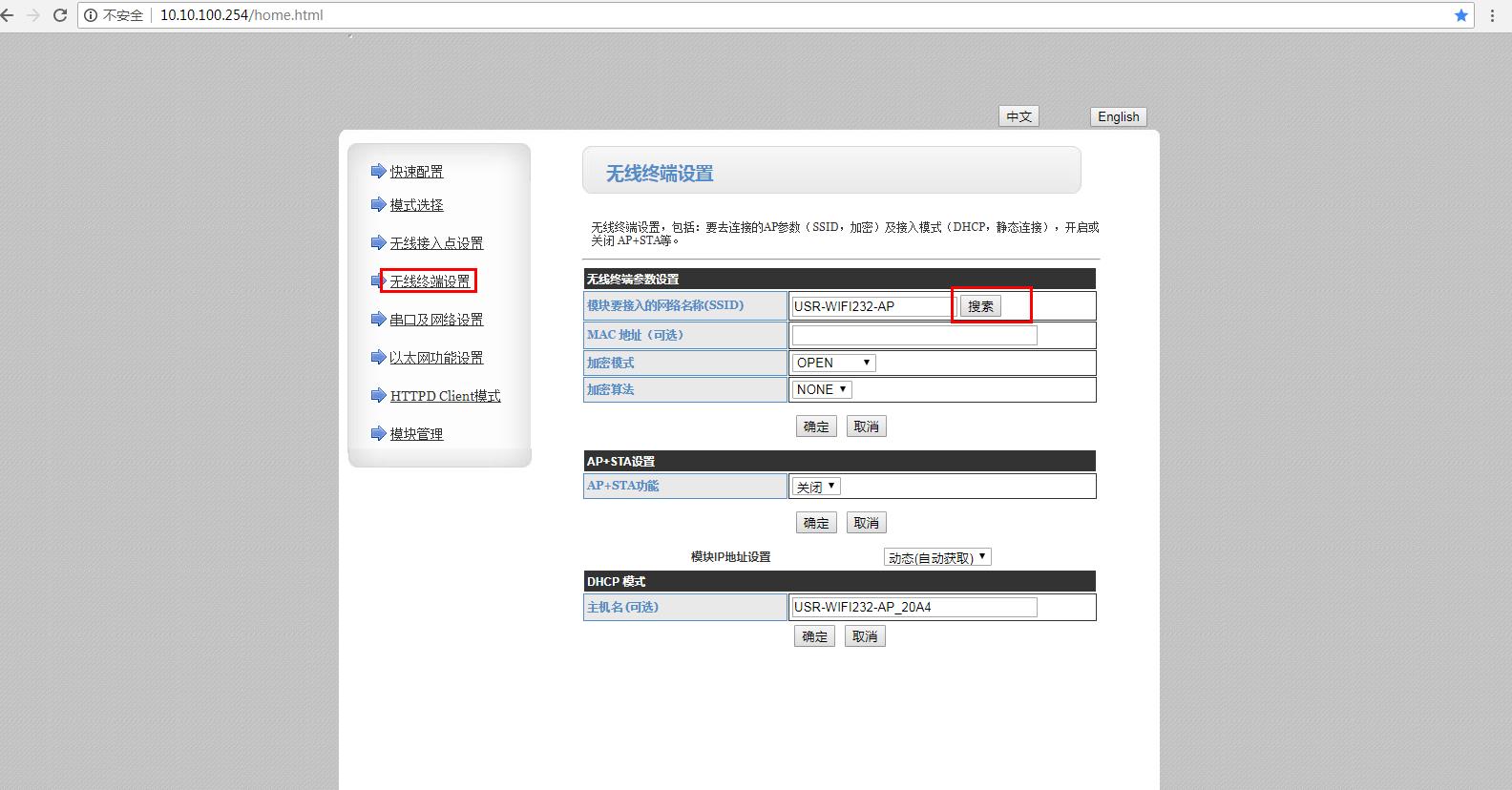 在无线终端设置中,点击模块要接入的网络名称SSID,可以手动输入USR-W610设置STA模式要连接路由器wifi的名称,或者点击后面的搜索,搜索路由器的wifi。勾选,并点击APPLY应用。跳出输入路由器wifi密码提示,输入路由器的wifi密码。点击确定。