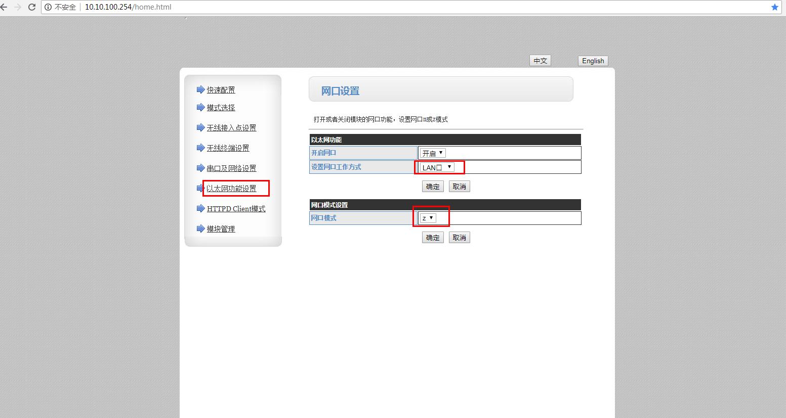 1、在以太网功能设置,网口工作模式是LAN口,网口模式设置Z。就是桥接模式。默认是n模式,需要改为z模式。点击确定。