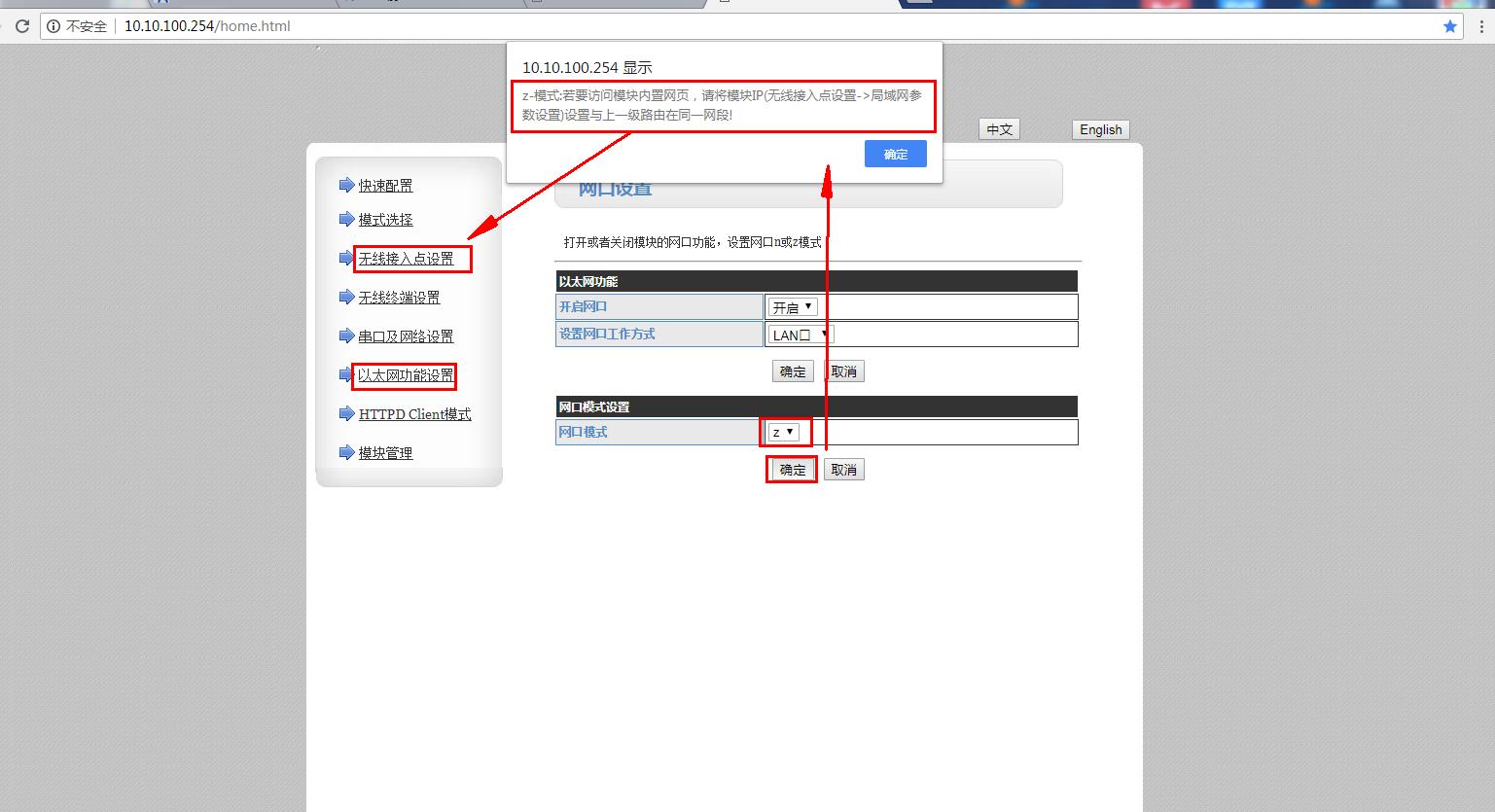 会跳出提示对话框,z-模式:若要访问模块内置网页,请将模块IP(无线接入点设置——》局域网参数设置)设置与上一级路由器再同一网段!