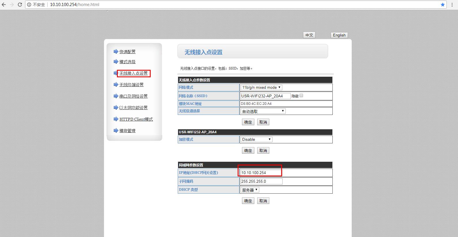 2、在无线接入点设置,局域网参数设置默认是10.10.10.254,需要修改为和USR-W610所连接路由器LAN IP同网端的IP。