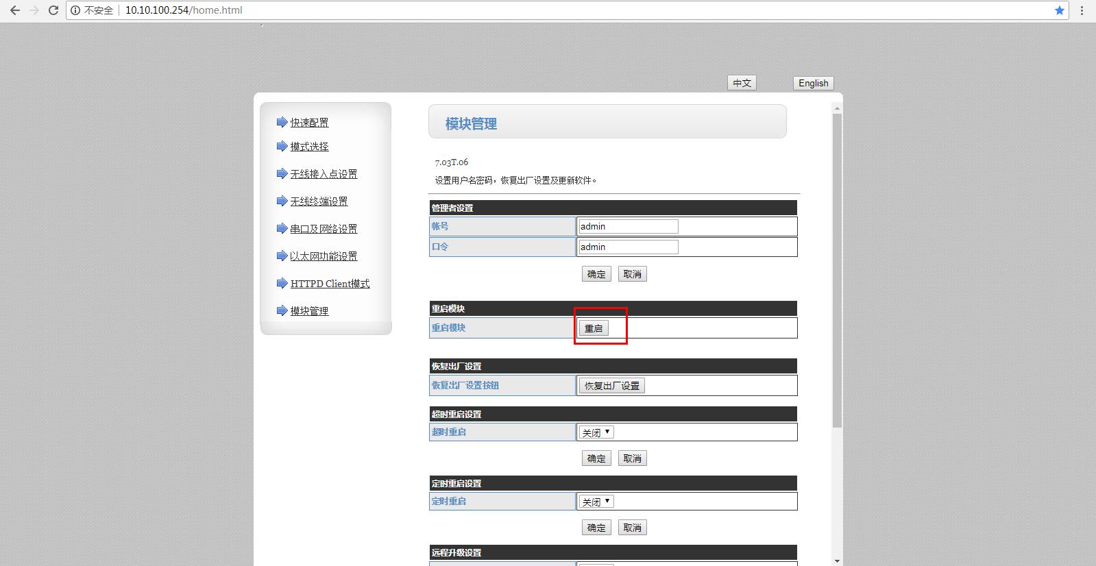 3、使用USR-W610默认IP,10.10.100.254,在浏览器输入登录USR-W610内置网页,登录名是admin,登录密码admin。