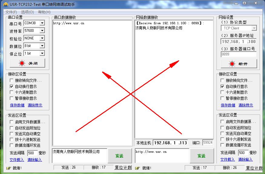 最后测试TCP server工作模式下,串口和网络的数据透传。
