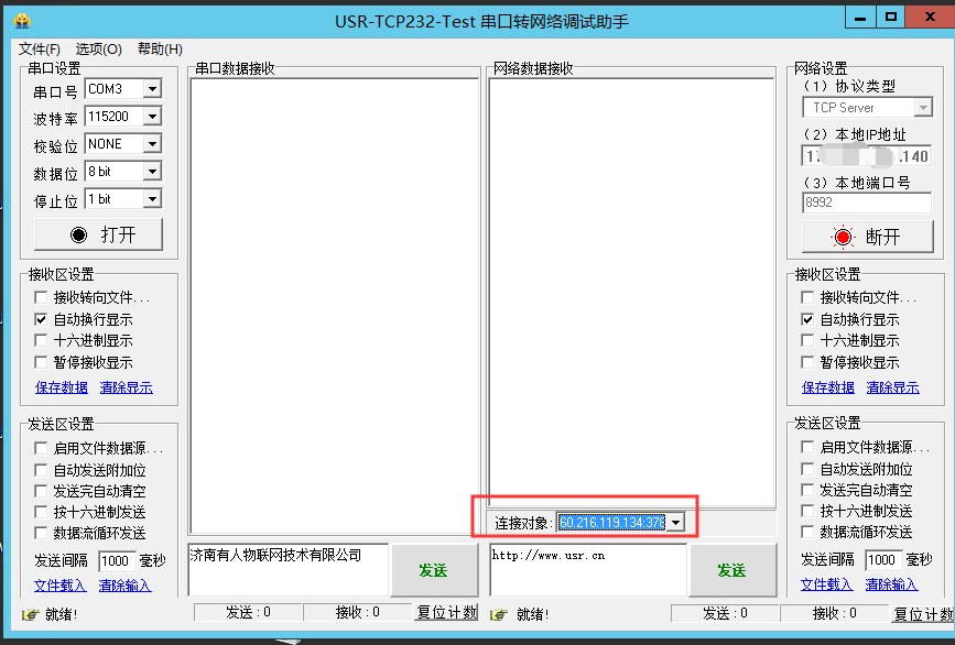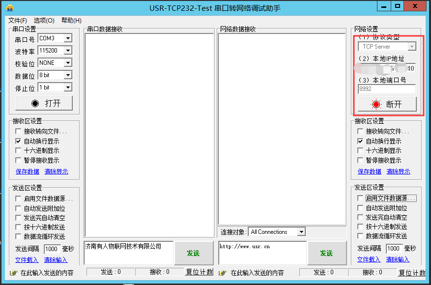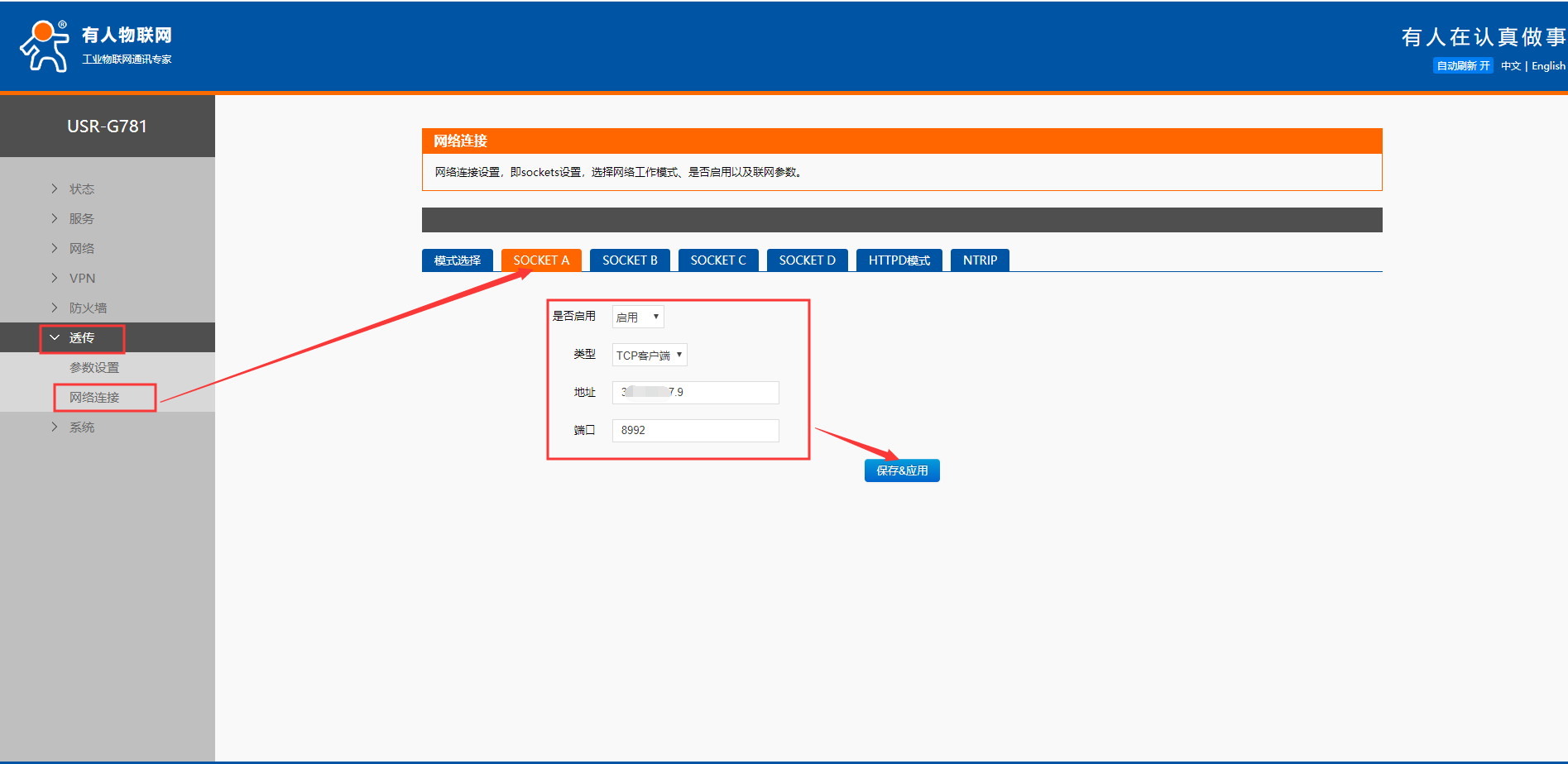 (2)透传——网络连接——SOCKETA——启用——设置IP和端口——保存应用