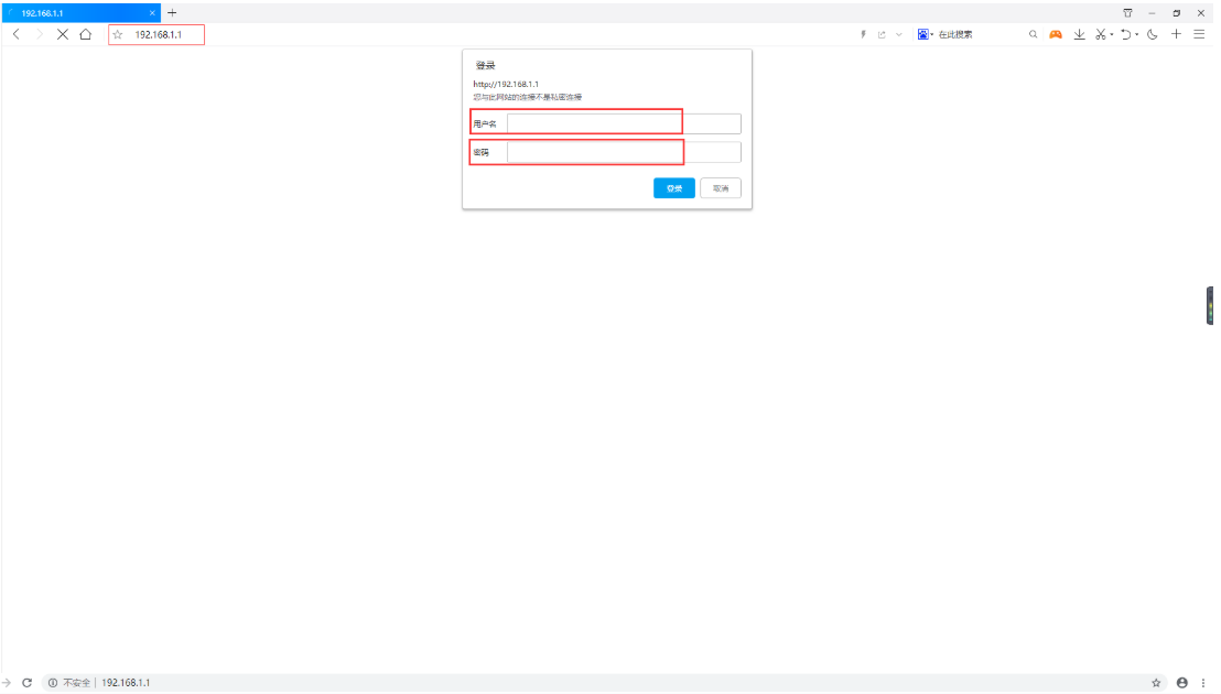 ②打开浏览器,在地址栏输入192.168.1.1后回车,弹出登录界面,填写用户名密码(出厂默认都是admin)点击确认,即可进入配置网页。