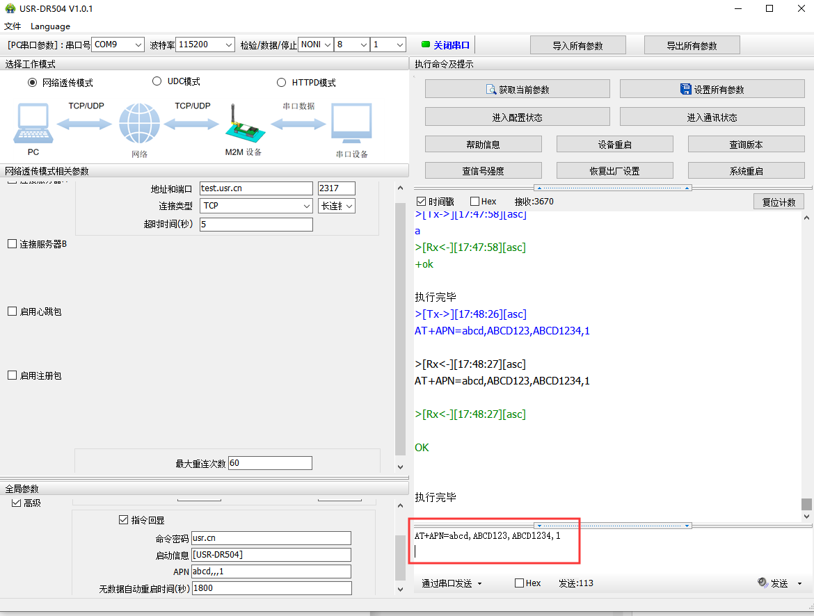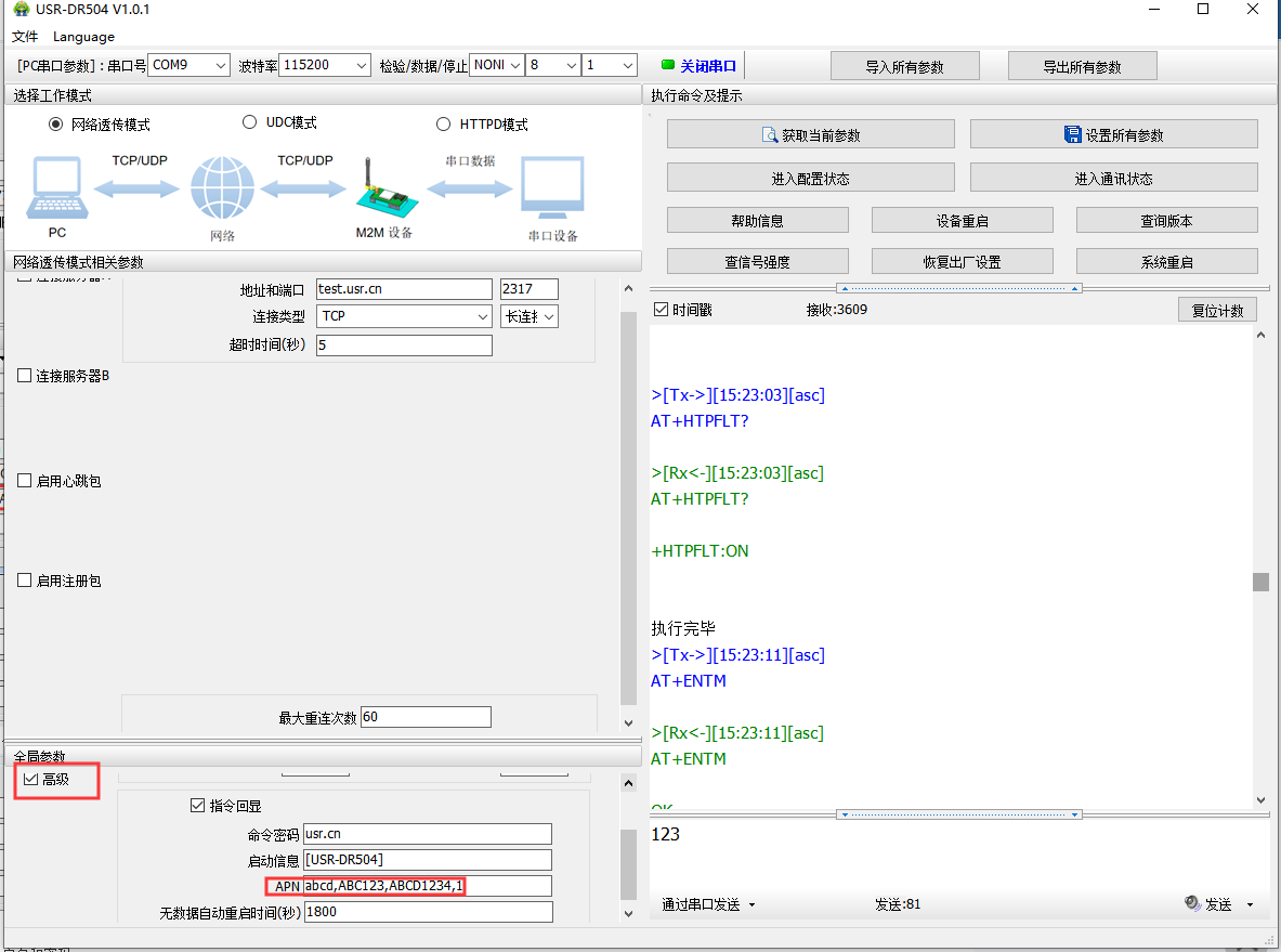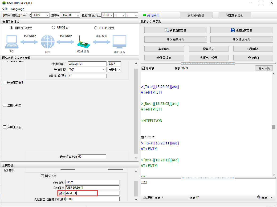 (1)未设置有关APN的相关参数,直接使用APN卡进行联网和服务器连接,进行相关参数配置之后再进行测试