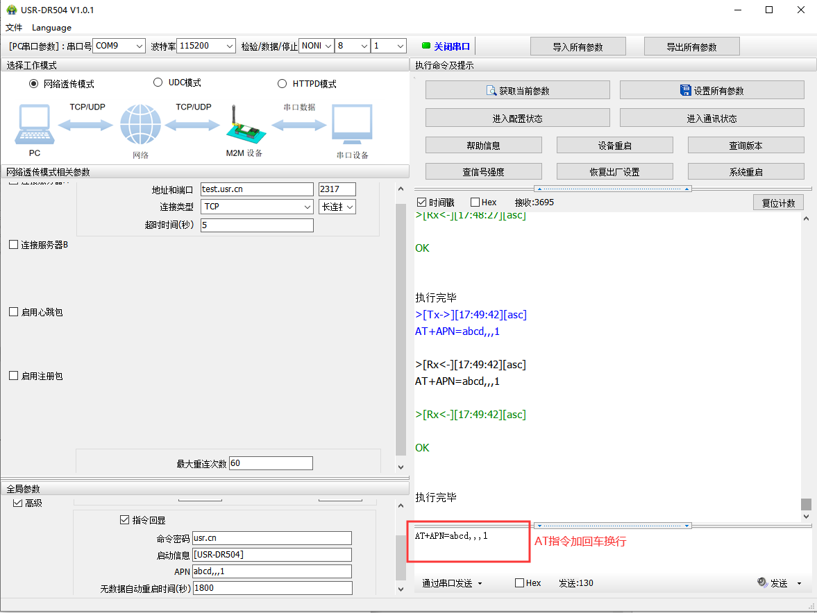 (3)也可以用AT指令配置,AT指令最后要加回车换行:
