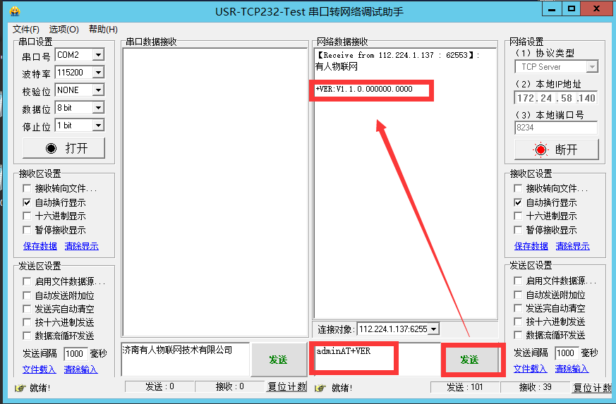 8. 通过服务器端网络调试助手发送带有密码(默认是admin)的AT指令可以实现网络AT指令功能,如查询模块版本号可以发送:adminAT+VER跟回车,如图。