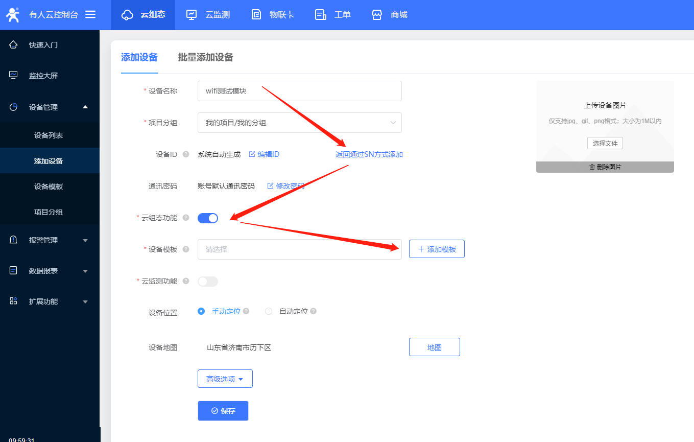 5、本次案例是C215连有人云进行数据显示,可以进入云组态,选择添加设备。