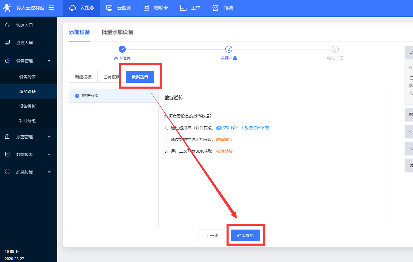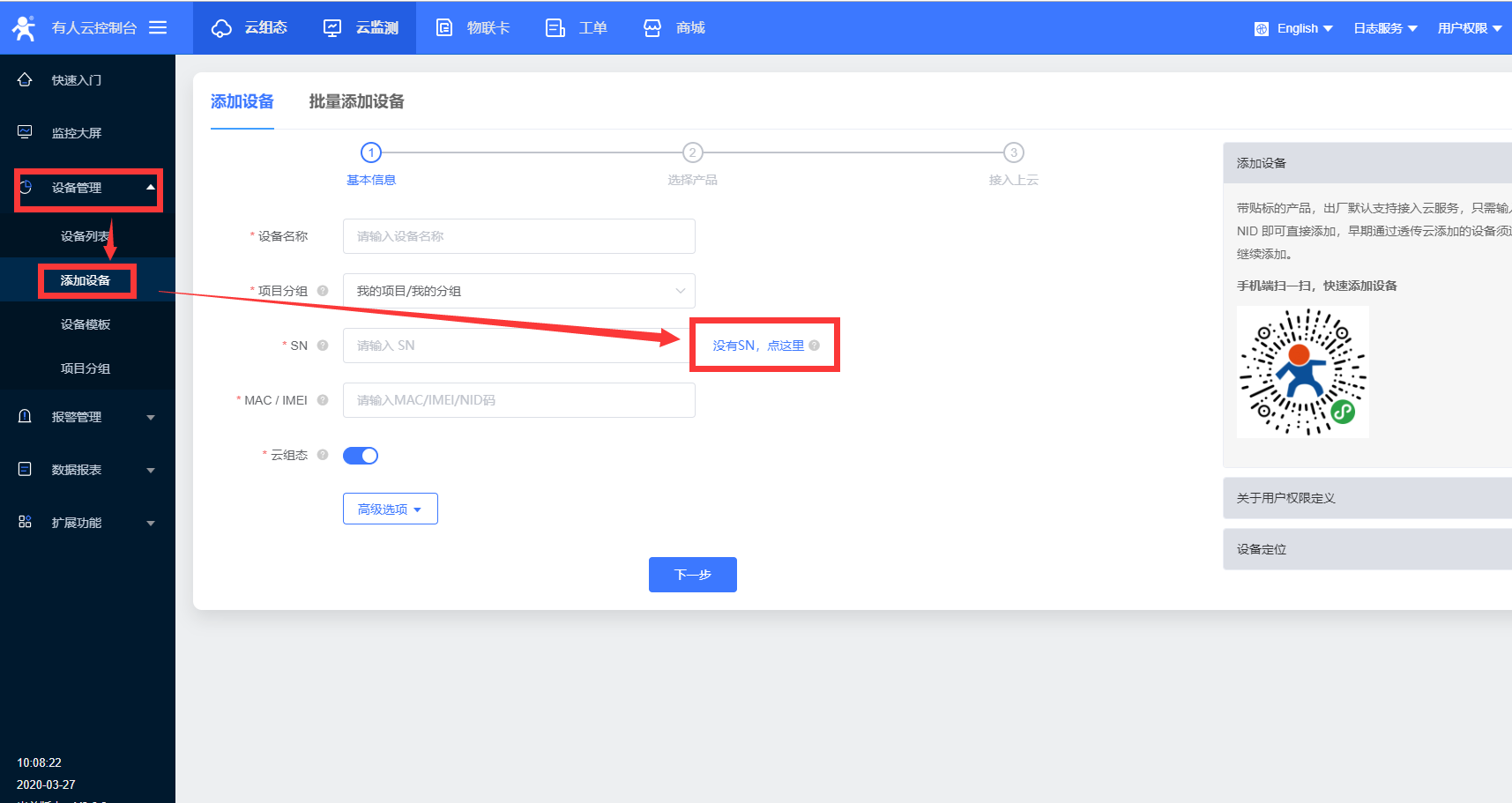 1、登陆云平台后,在 设备管理》添加设备 中添加一个设备,点击框后面的蓝字“没有SN”