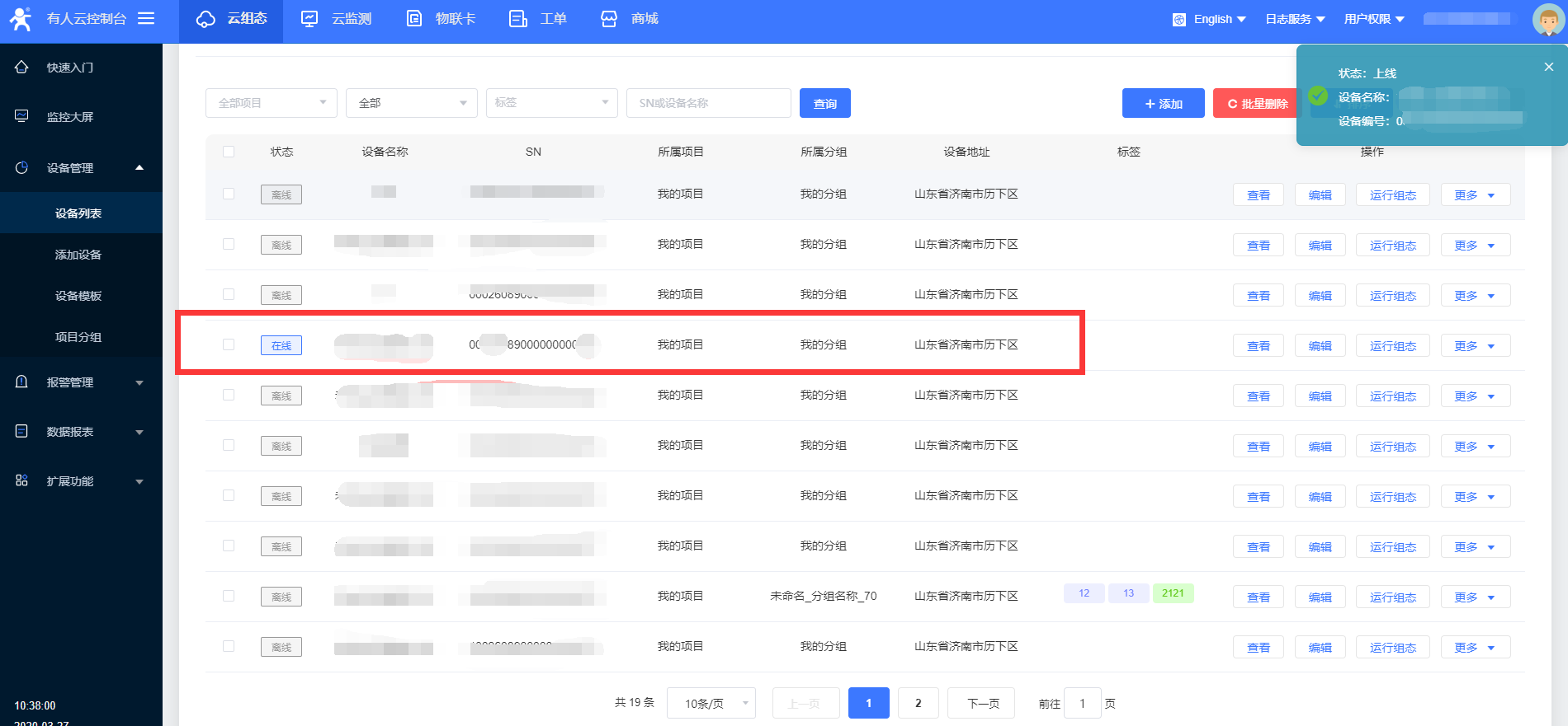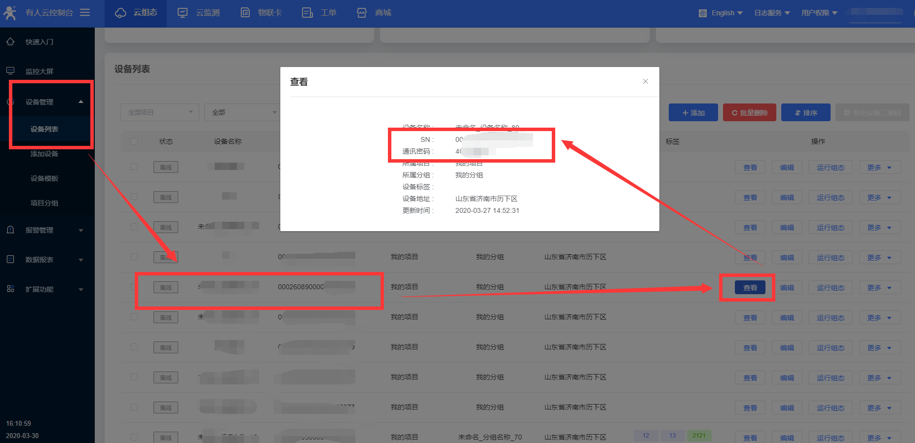 4、在设备管理》设备列表 可以看到添加的设备,点击后面的查看,可以看到设备生成的编号及通讯密码