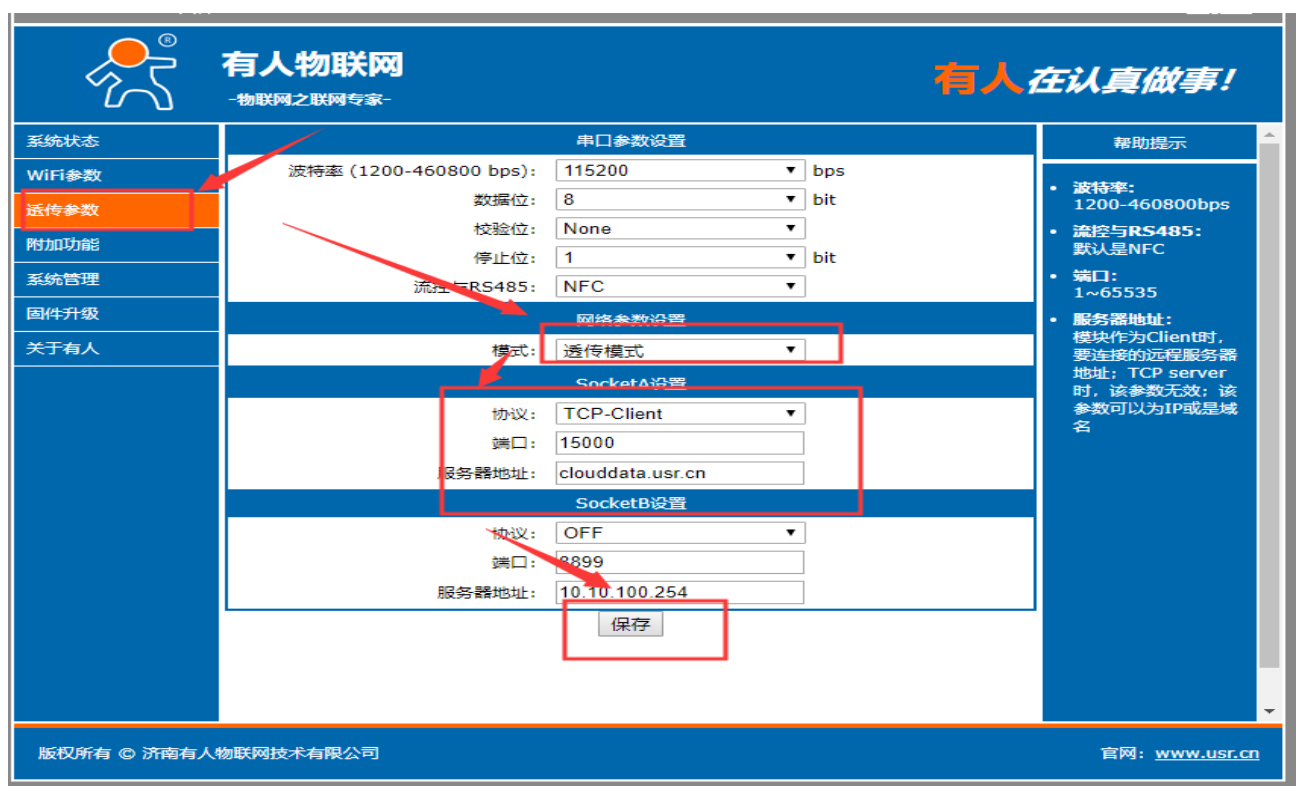 2、进入内置网页(10.10.100.254)内置网页的账号和密码都是admin。进入透传参数,选择透传模式,服务器地址:clouddata.usr.cn端口15000,保存