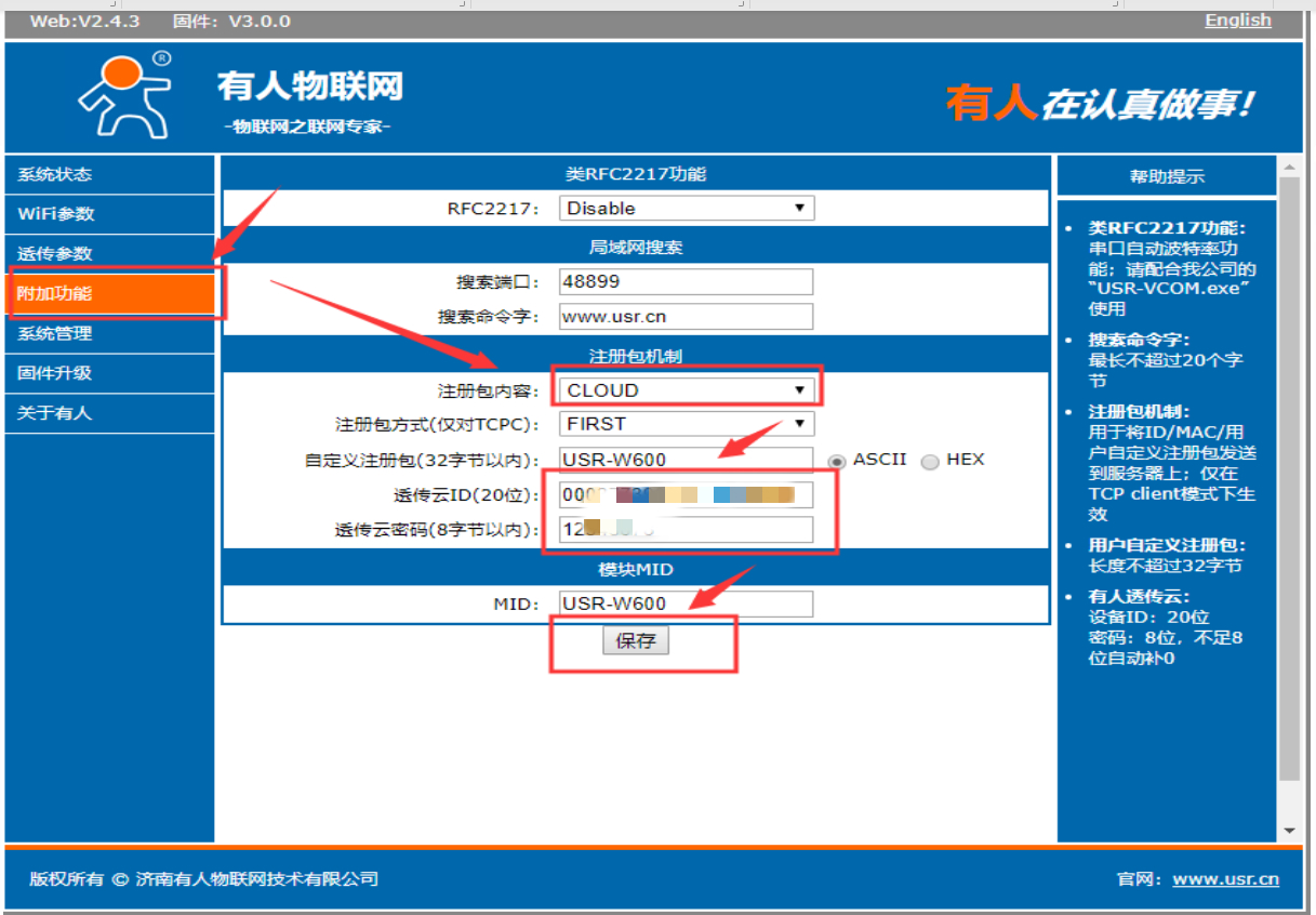 3、进入附加功能,注册包内容:cloud,填上刚才在有人云上新添加的设备的编号,和密码,点击保存