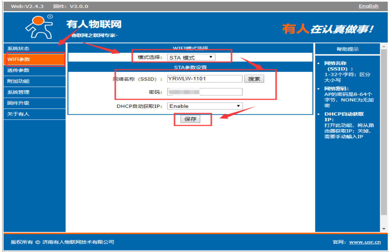 4、在wifi参数,进入以后选择模式选择模式选择为sta模式,点击确定,先不要重启,等设置完所有的参数再重启设备