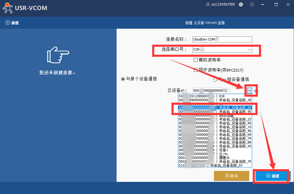 3、选择一个不常用的串口号,选择云端刚才添加的设备,点新建,生成设备对应的虚拟串口