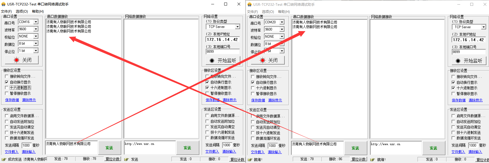 USR-W600的基本通讯测试:http://www.usr.cn/Faq/310.html