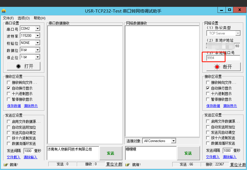 1. 先在4G无线传输终端的服务器端打开一个网络调试助手,设置成TCP server及本地端口号(在该案例中我设置的是9999),开始监听