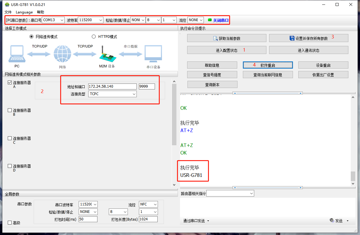 打开串口--->进入配置状态--->成功的话,会返回执行完毕--->勾选连接服务器A,修改服务器地址和端口--->设置并保存参数--->软件重启或者设备重启(软件重启速度要快一些),重启后,可以看到LINKA指示灯常亮