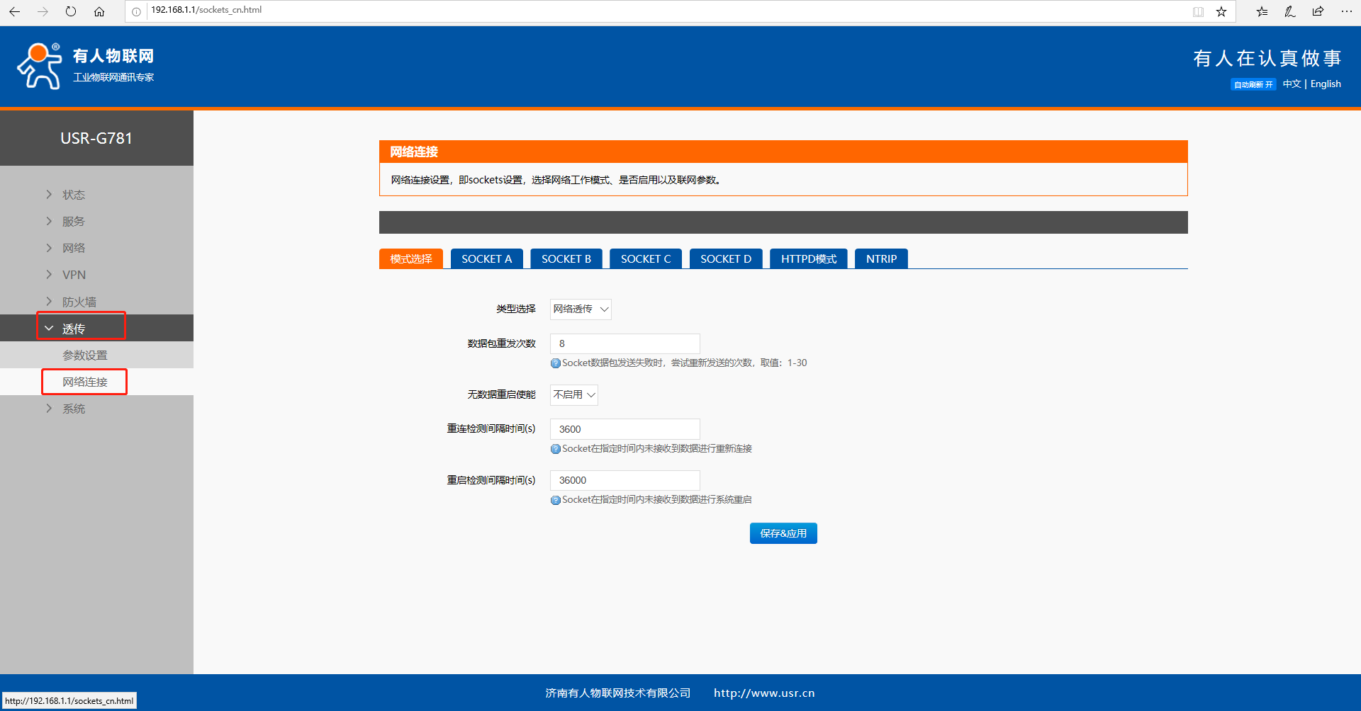 设置模式选择为网络透传模式,保存并应用
