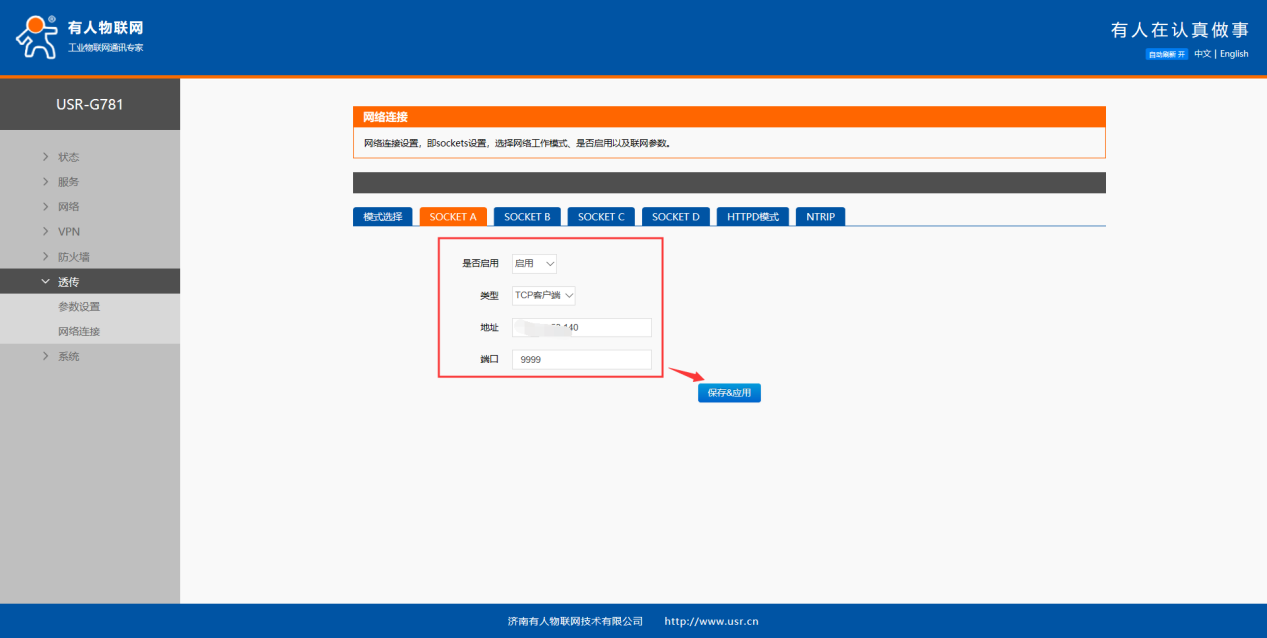 在内置网页--透传--网络连接中设置参数