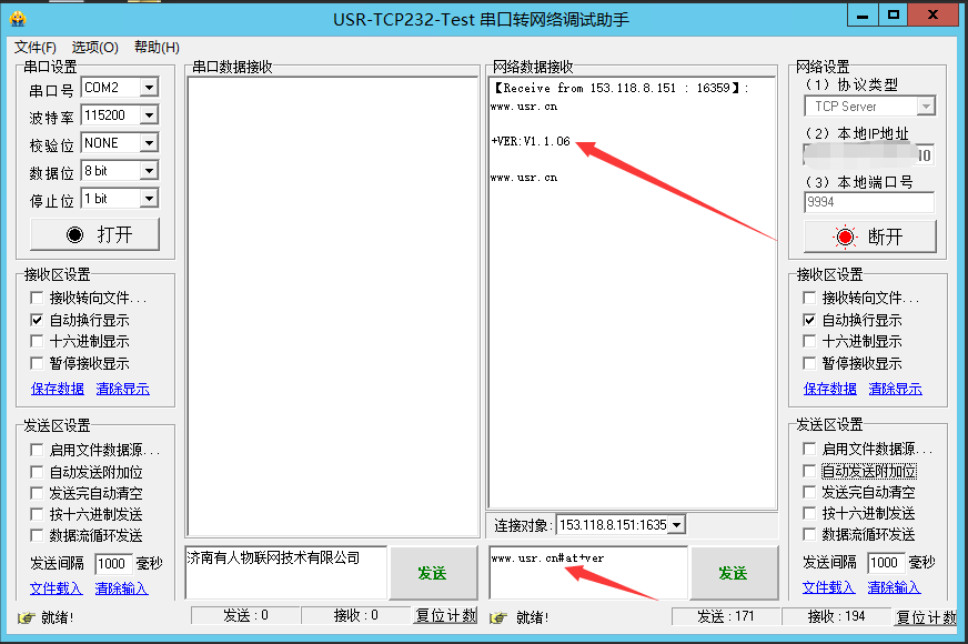 3.在远程服务器端输入www.usr.cn#at+ver加回车(注:回车必须加,若不加回车会返回错误警告),点击发送,会返回781的固件版本号。(网络at指令使用的是命令密码+at指令的方式。命令密码默认状态下是www.usr.cn#。若您忘记了命令密码,可以通过at指令AT+CMDPW来查询命令密码)