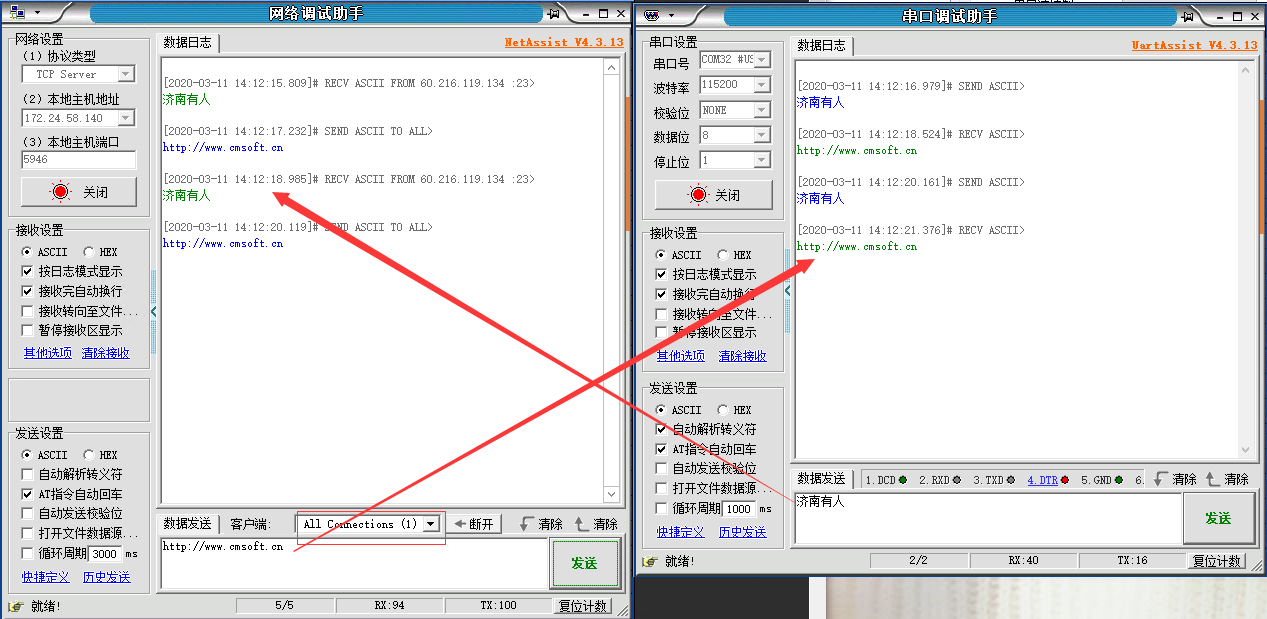 3.重启后进行通信测试,测试结果如下图所示。可以看到数据收发都是正常的。