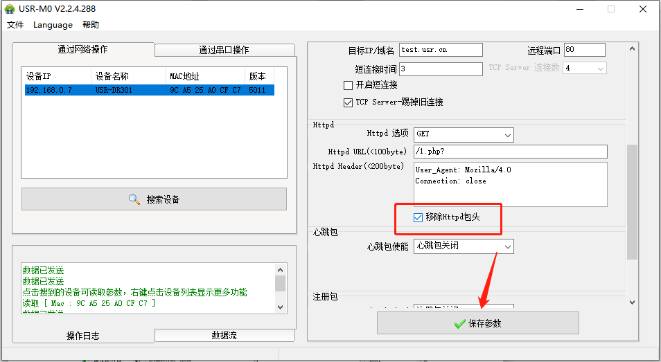 点击“搜索设备”当搜索列表中出现301的设备后,单击搜索到的设备,IP设置为DHCP,模块设置为Httpd Client模式,请求方式GET,URL为/1.php?,设置服务器地址test.usr.cn,端口80,设置并保存所有参数,重启模块。(本说明文档使用为有人测试服务器)