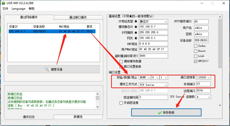 点击“搜索设备”当搜索列表中出现301的设备后,单击搜索到的设备,查看其配置信息,协议类型选择TCP Server,本地端口可随意设置,只要不是特殊端口或重复端口即可,本例以23为例。设置完成后重启设备,参数需要重启生效。