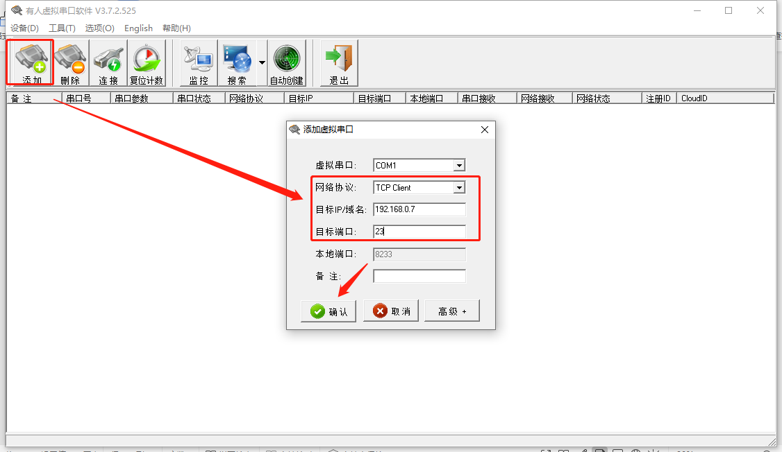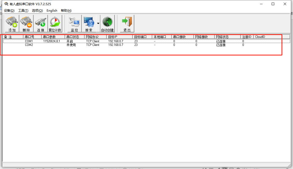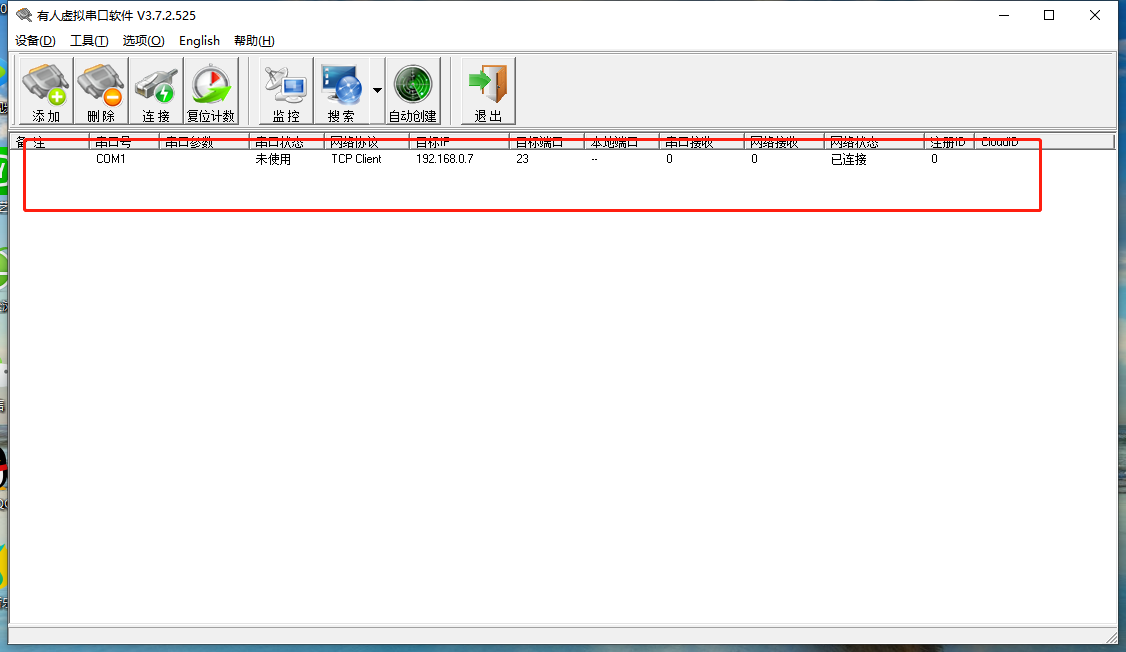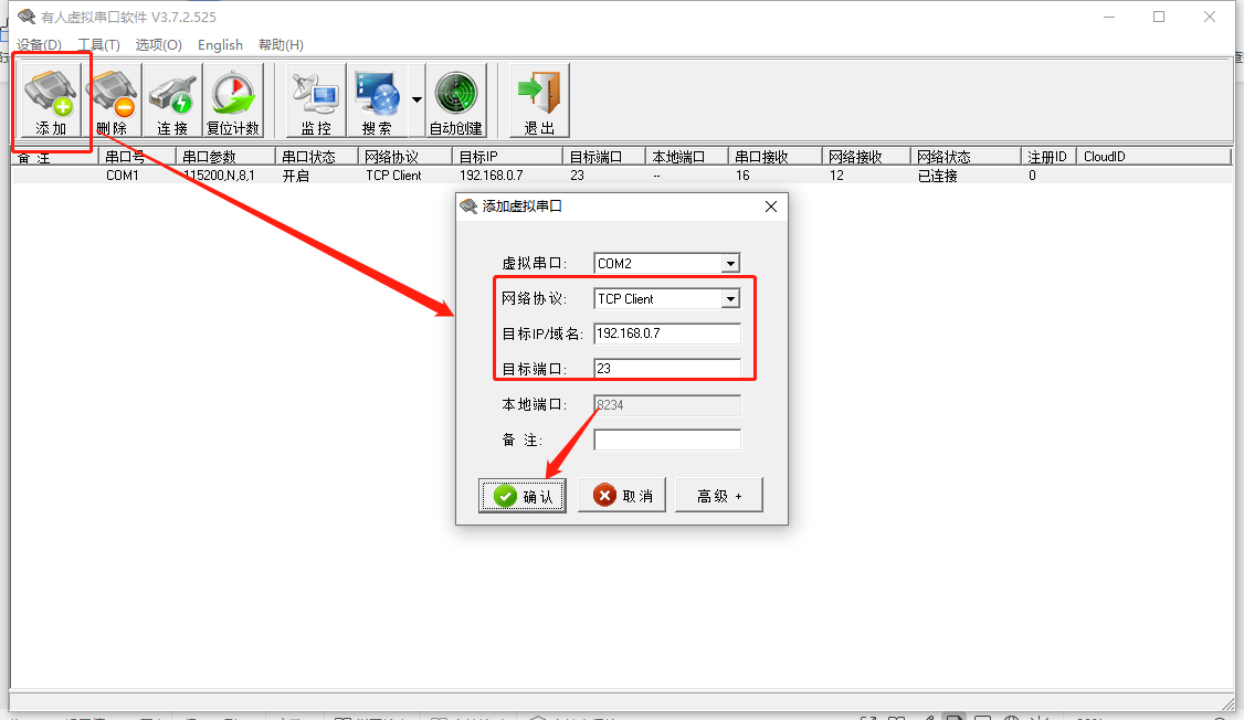 点击“添加”,添加一个新的虚拟串口COM1,协议类型选择TCP Client,目标IP为301的默认IP:192.168.0.7,目标端口为301的本地端口:23,填写完成后点击确定。可以看到新添加的虚拟串口显示已连接。