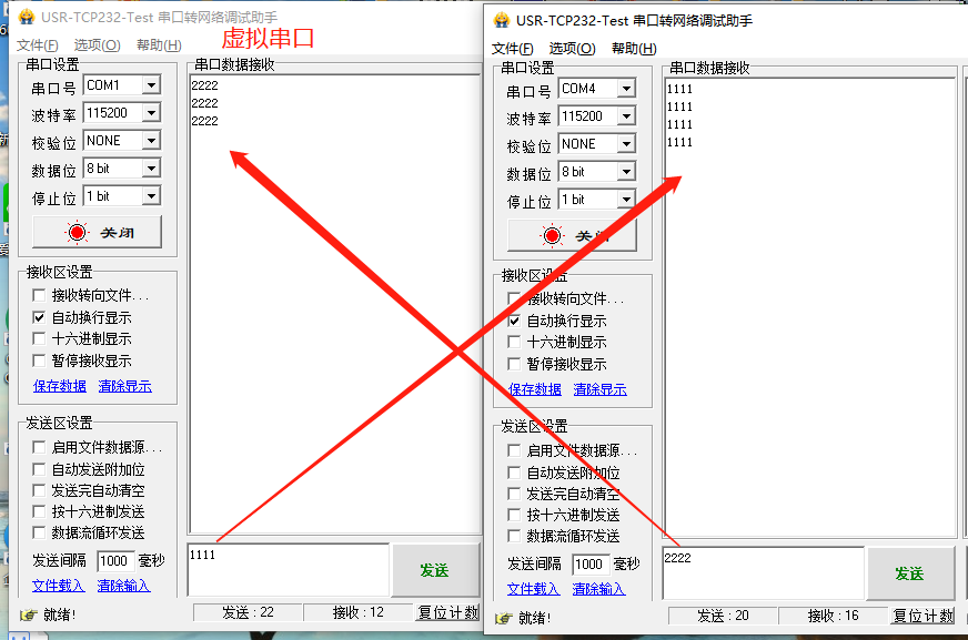 打开两个串口调试助手,分别选择正确的串口以及串口参数,互发数据,可以分别看到数据的接收。