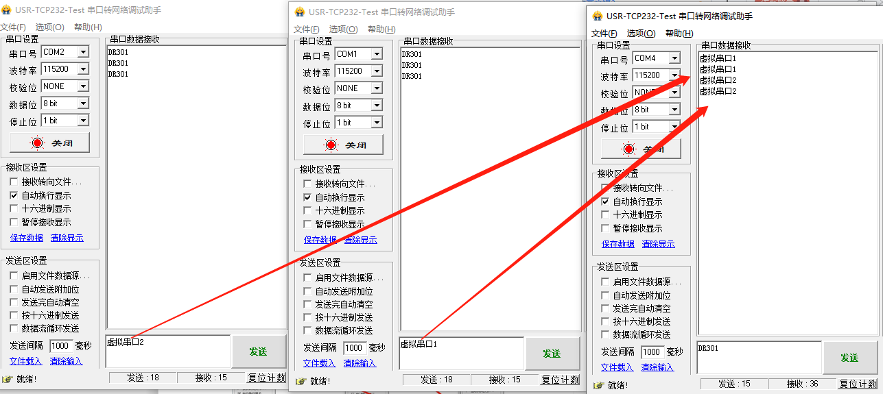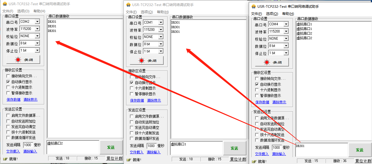 打开三个串口调试助手,分别选择正确的串口以及串口参数,互发数据,可以分别看到数据的接收。