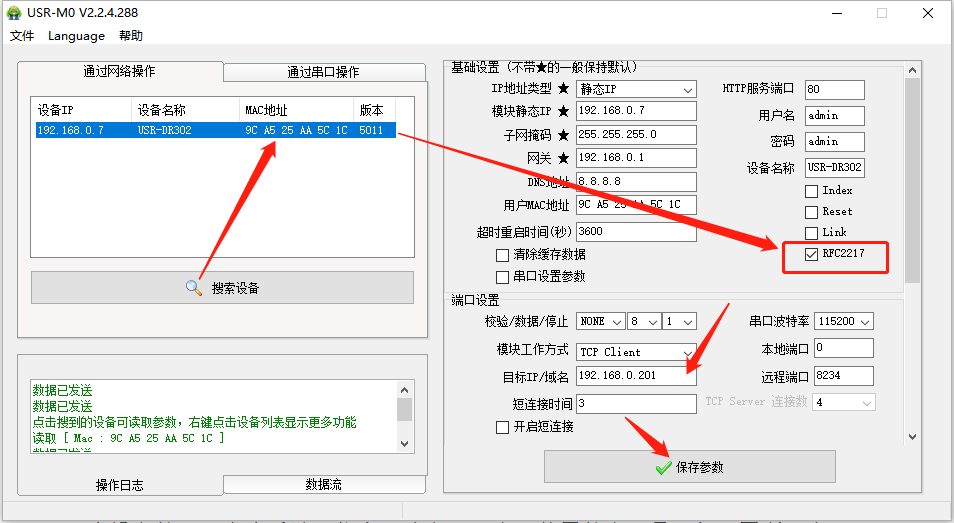 点击“搜索设备”当搜索列表中出现302的设备后,单击搜索到的设备,查看其配置信息,勾选RFC2217,工作方式:TCP Client,目标IP:92.168.0.201,远程端口8234。设置完成后点击保存参数。