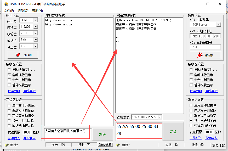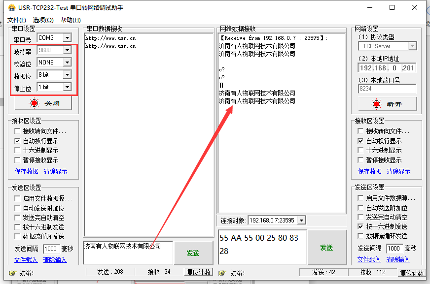 将模块串口参数修改为9600、NONE、8、1,需要网络端按十六进制下发55 AA 55 00 25 80 83 28,发送完成后,软件打开串口需要修改为9600、NONE、8、1, 不然数据会显示为乱码。