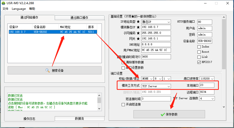 点击“搜索设备”当搜索列表中出现302的设备后,单击搜索到的设备,查看其配置信息,协议类型选择TCP Server,本地端口可随意设置,只要不是特殊端口或重复端口即可,本例以23为例。设置完成后重启设备,参数需要重启生效。