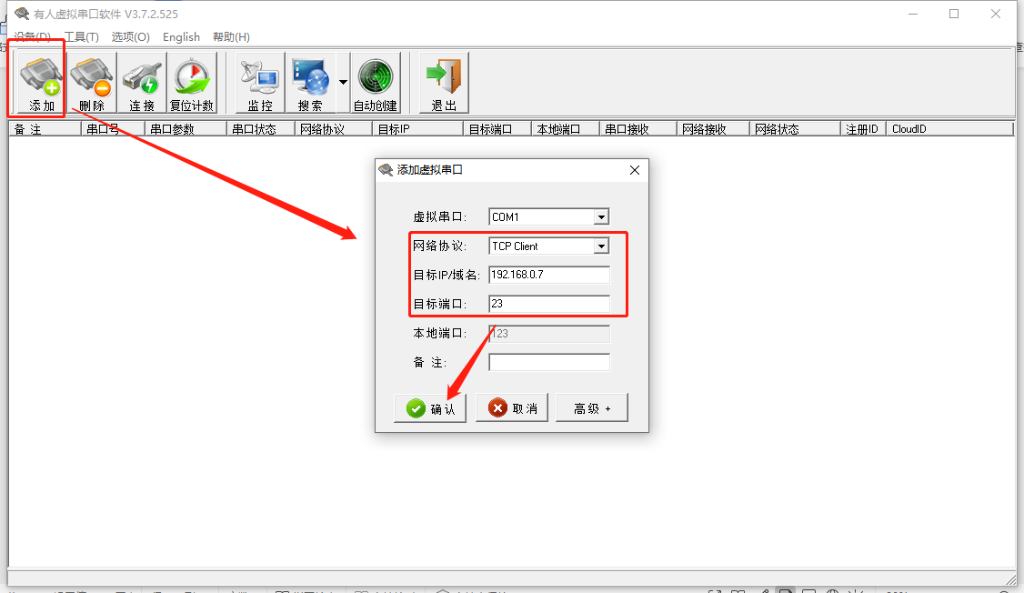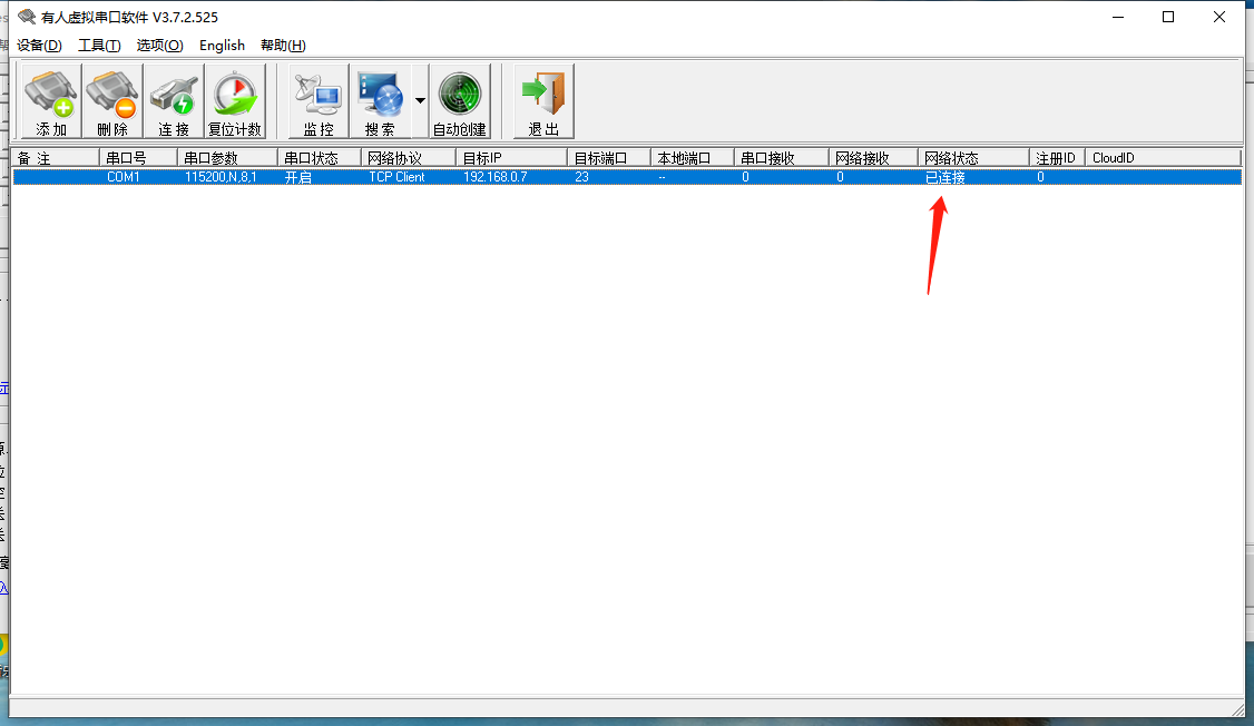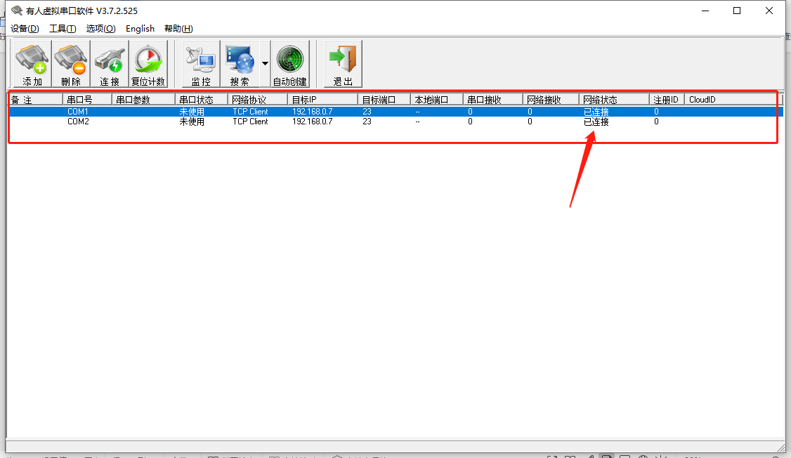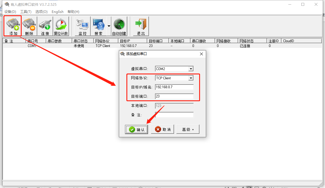 点击“添加”,添加一个新的虚拟串口COM1,协议类型选择TCP Client,目标IP为302的默认IP:192.168.0.7,目标端口为302的本地端口:23,填写完成后点击确定。可以看到新添加的虚拟串口显示已连接。