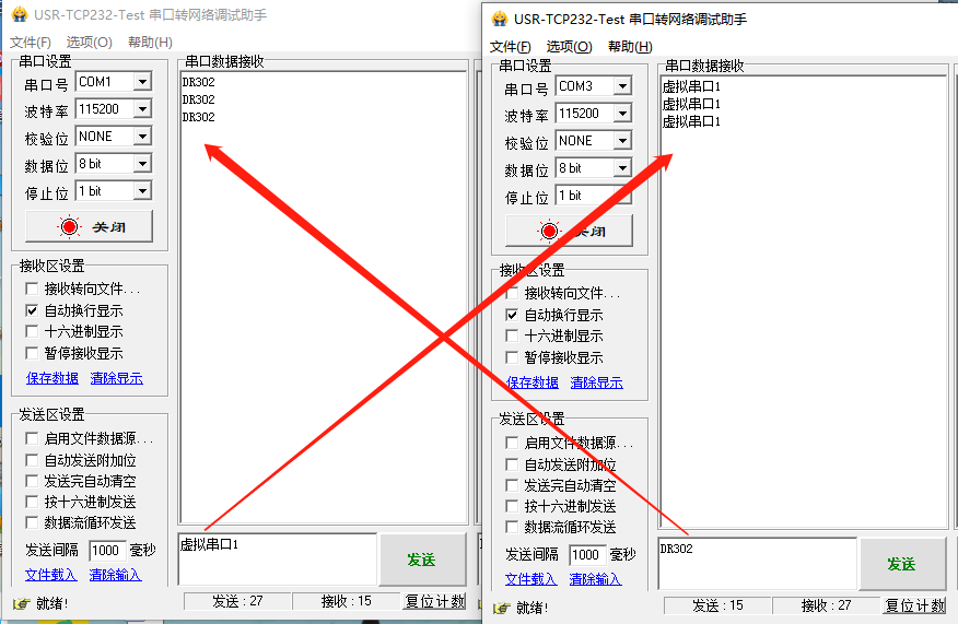 打开两个串口调试助手,分别选择正确的串口以及串口参数,互发数据,可以分别看到数据的接收。