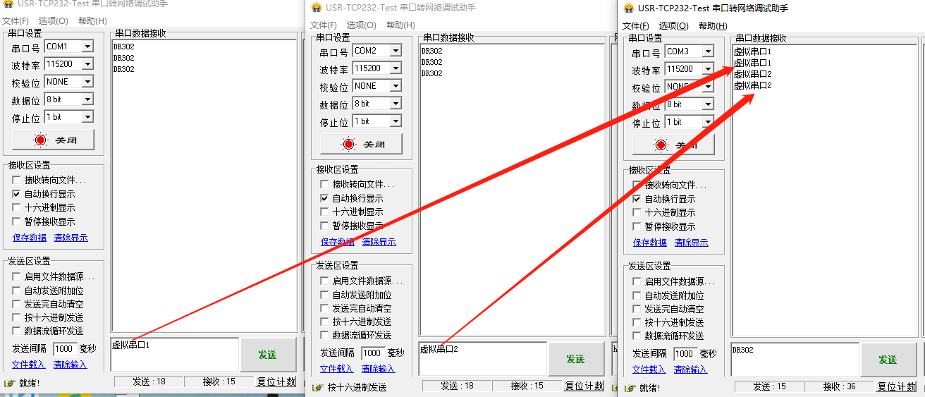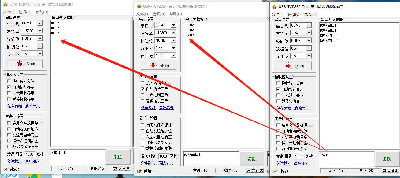 打开三个串口调试助手,分别选择正确的串口以及串口参数,互发数据,可以分别看到数据的接收。