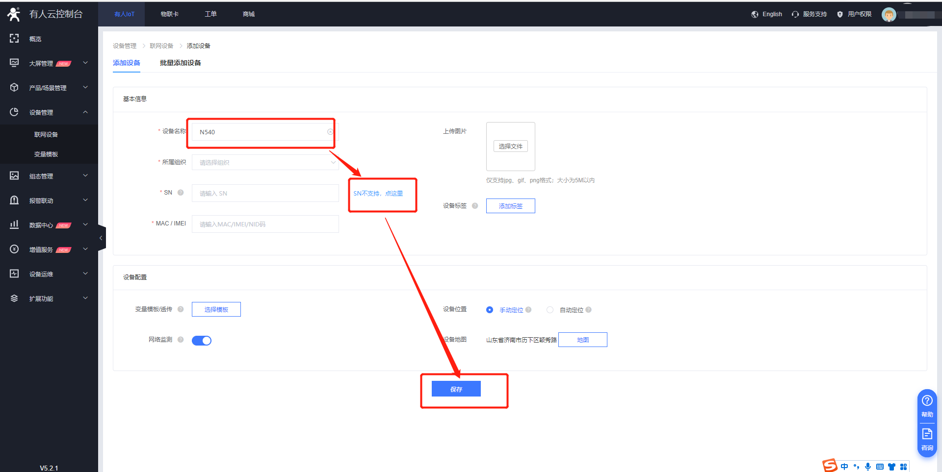 2、添加设备(名称可自定义,按照不支持Sn方式添加设备)