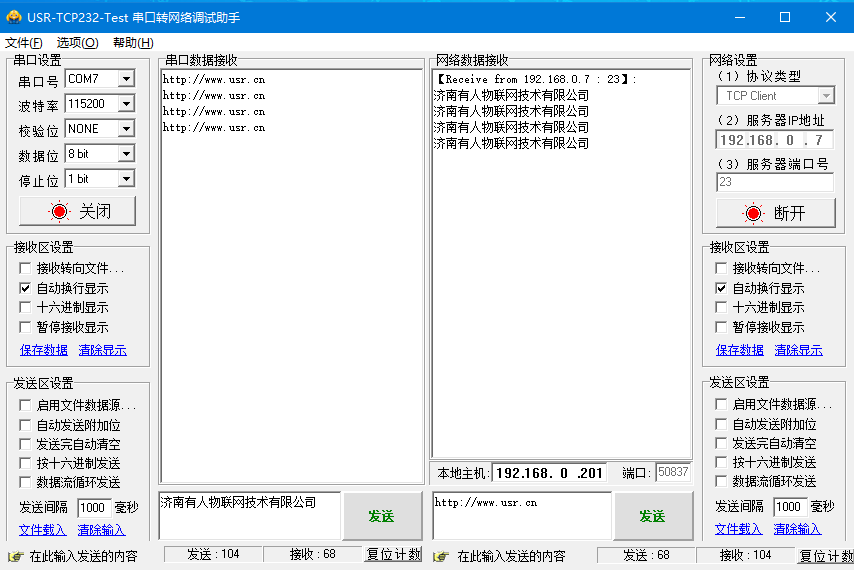 网络助手点击连接,有连接对象之后,测试串口和网络之间的数据传输。