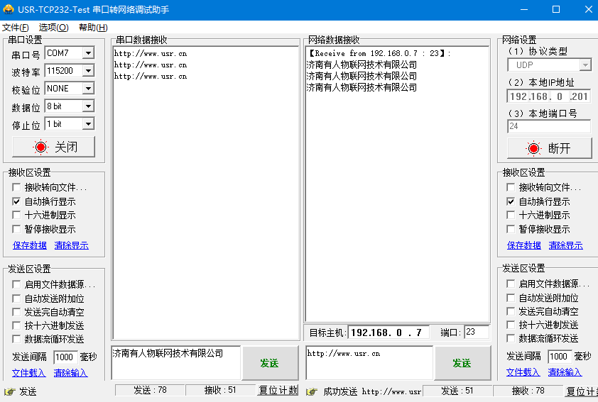N540 RS485串口做UDP server,电脑下载的串口网络助手,左侧用COM口打开,串口参数和RS485串口参数保持一致,波特率、数据位、停止位、校验位。右侧用UDP打开,本地IP填电脑的IP,本地端口填电脑的端口24。目标主机填N540的IP,端口填23。