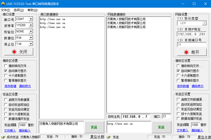 N540 RS485串口做UDP client,电脑下载的串口网络助手,左侧用COM口打开,串口参数和RS485串口参数保持一致,波特率、数据位、停止位、校验位。右侧用UDP打开,本地IP填电脑的IP,本地端口填电脑的端口24。目标主机填N540的IP,端口填23。