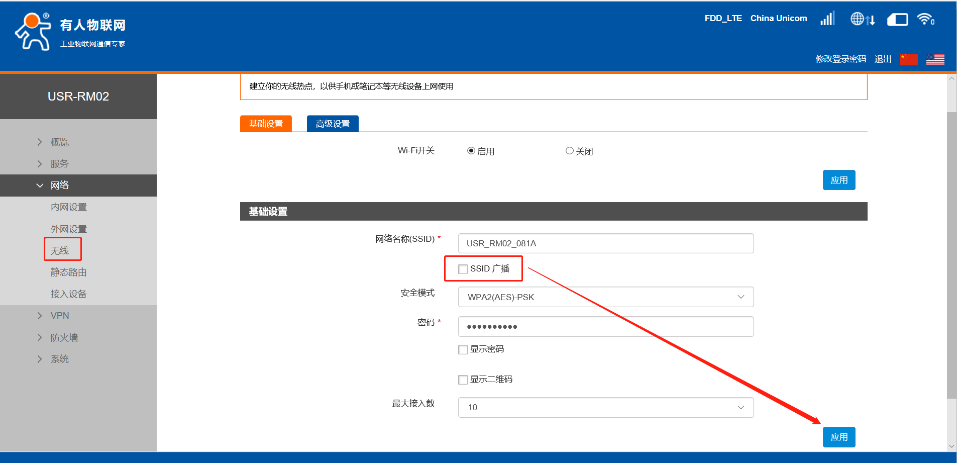 1、进入网络--无线,进入修改界面,不勾选SSID广播,之后点击应用。